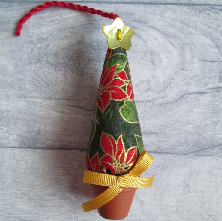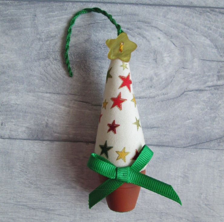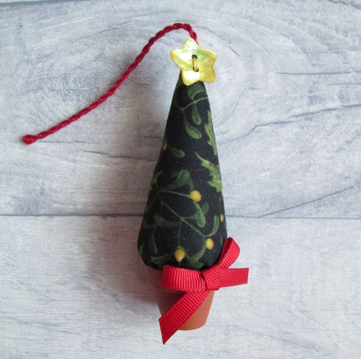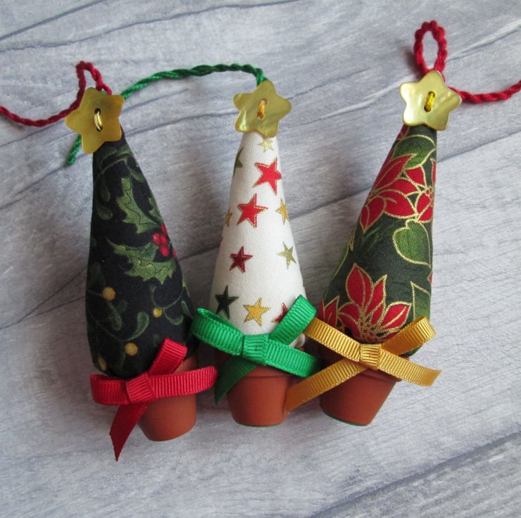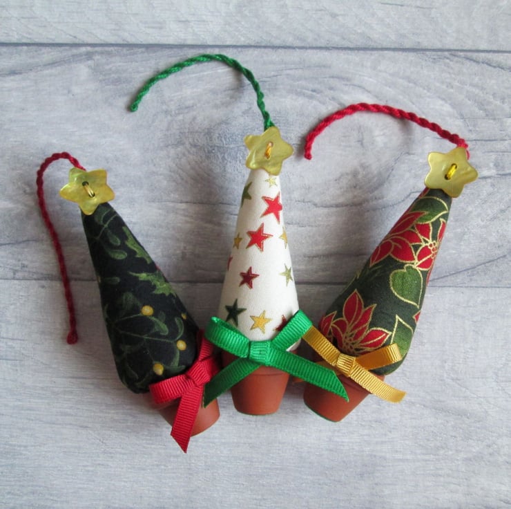 Three little Christmas trees to hang on your Christmas tree. Each is made from a different festive cotton print and 'planted' in a tiny terracotta pot. They are then finished with a shell star button, ribbon bow and a twisted thread hanging loop (simply untwist, loop over the branch, then allow to retwist). This set all measure approximately 11 cm tall and comprise: