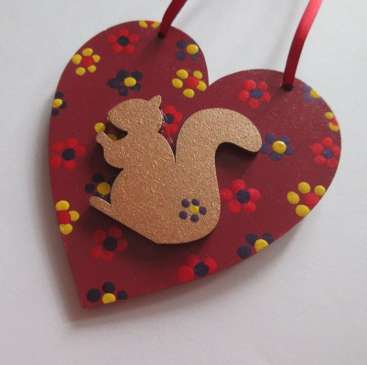 This is an 8cm x 8cm wooden heart shape, hand painted, and embellished with a wooden hand painted squirrel.