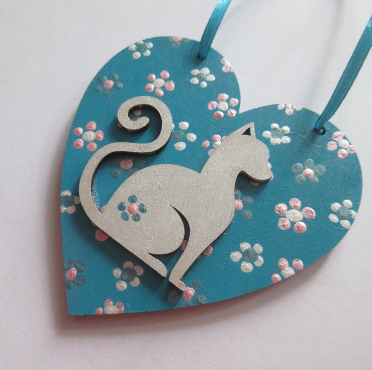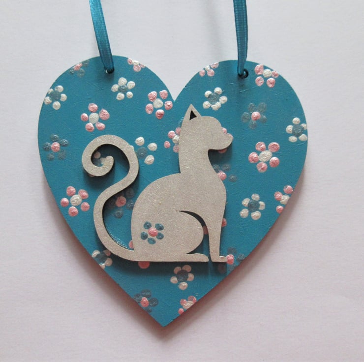 This is an 8cm x 8cm wooden heart shape, hand painted, and embellished with a wooden hand painted cat.