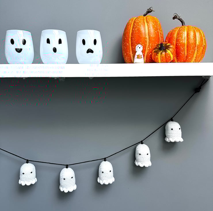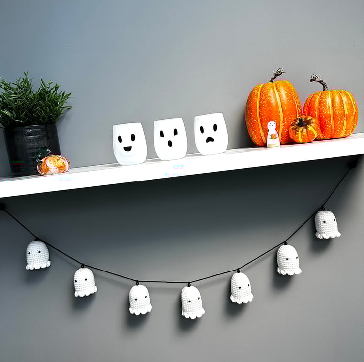 Perfect for a Hallowee’en party, this garland consists of seven crocheted ghosts and measures approximately 1.25 metres in length