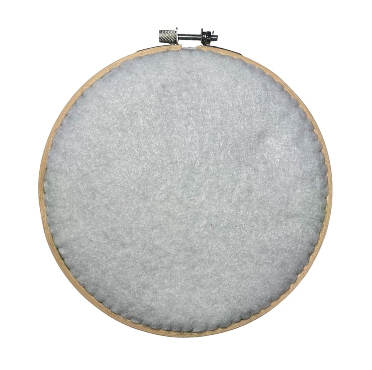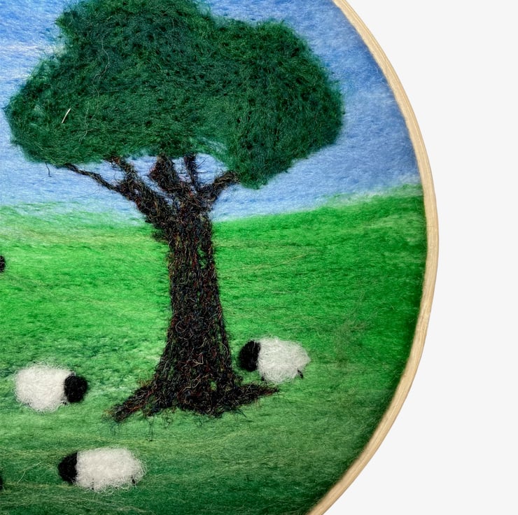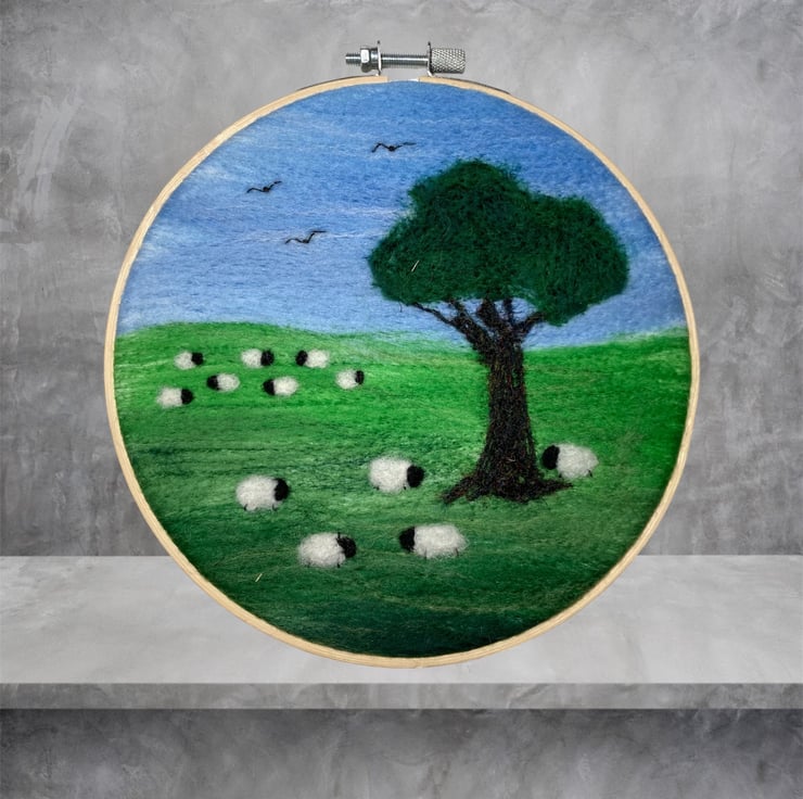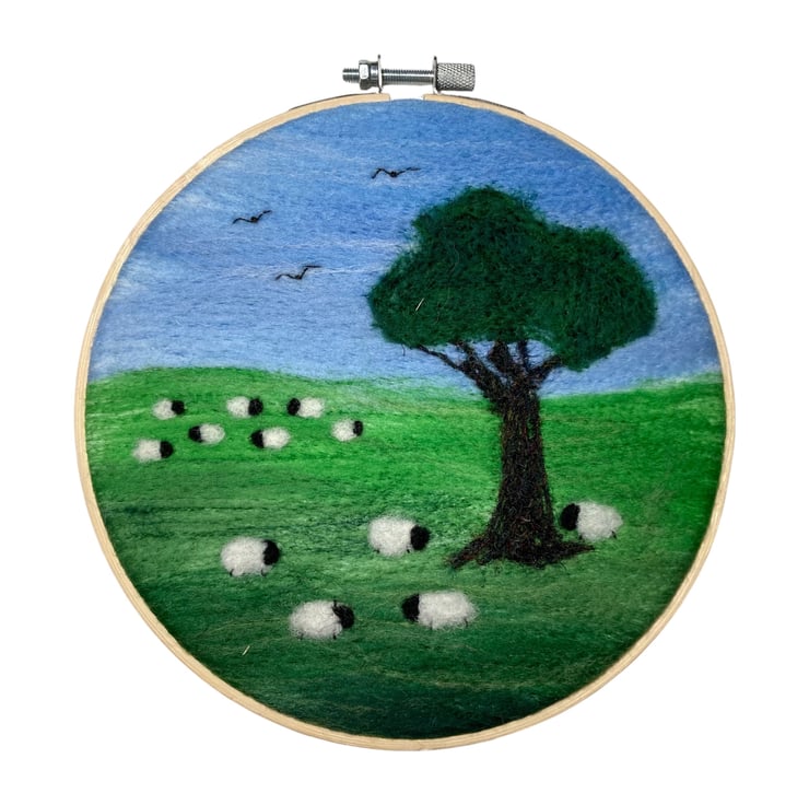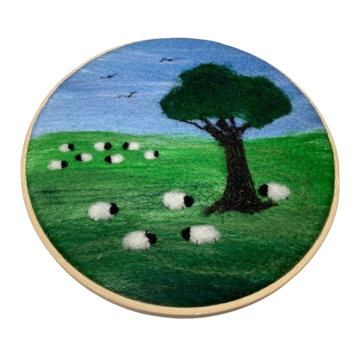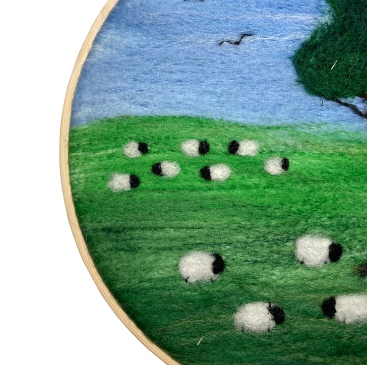 This lovely woollen textile picture of sheep grazing in the fields has been needle felted using woollen fibres and a barbed felting needle. The fibres have been needle felted to a piece of backing felt. After creating the basic background, details of the tree and sheep have been added and a few of birds stitched on using thread. The resulting picture has been mounted in a 6" (15cm) diameter embroidery hoop and the reverse of the picture has been covered using a piece of white commercial felt.