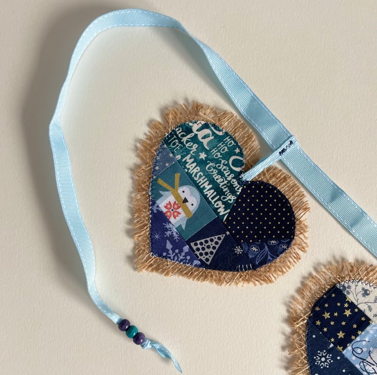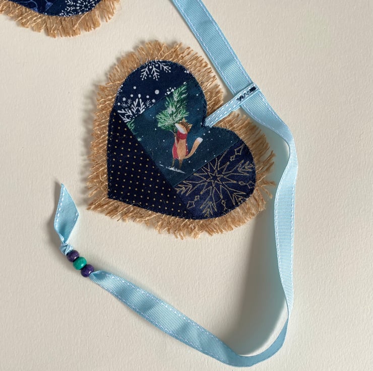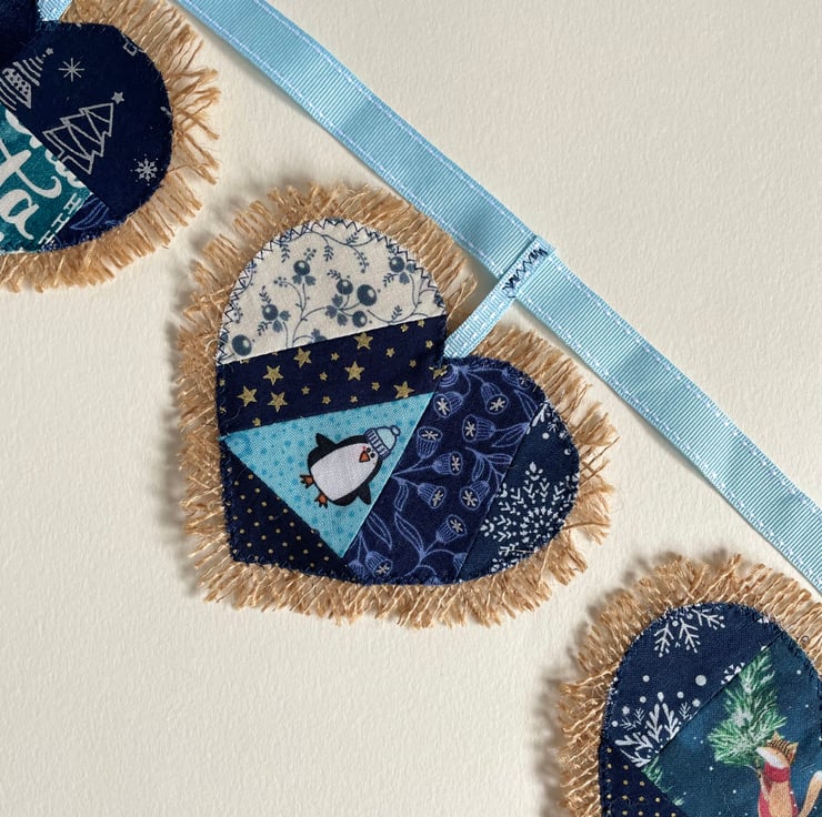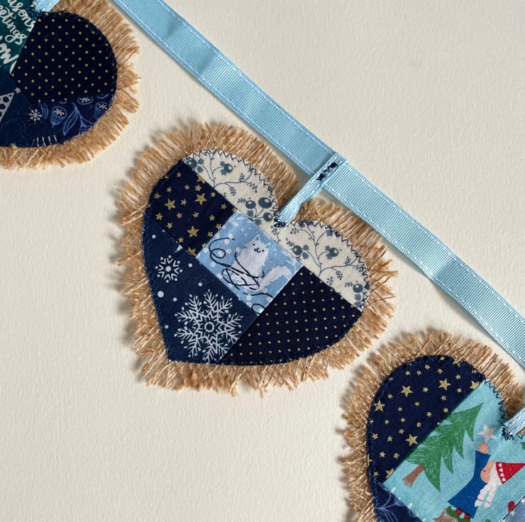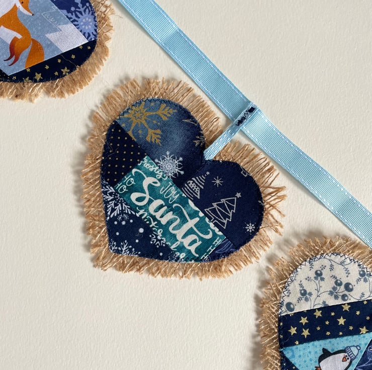 Cute hessian bunting with Christmas design. Heart shape. 7 hearts. 173 cm long from side to the other.