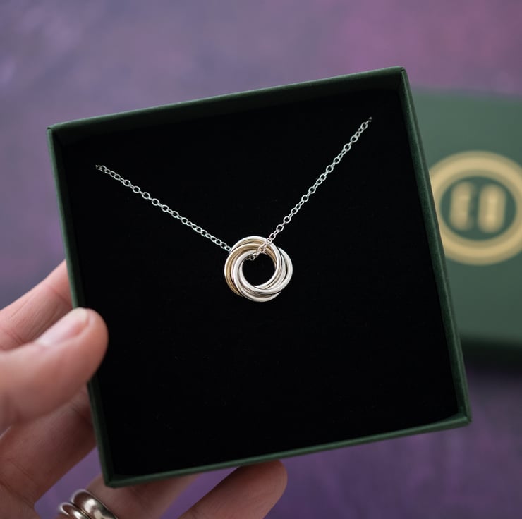 Each ring often symbolises a decade making it a special milestone gift as a 50th birthday necklace or Golden wedding anniversary necklace.