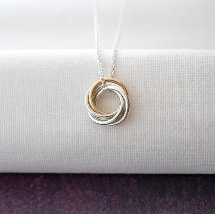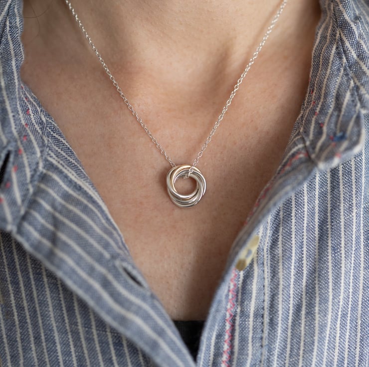 A popular necklace in our range, this 5 ring necklace is made by hand with four sterling silver rings and one solid 9ct gold ring.