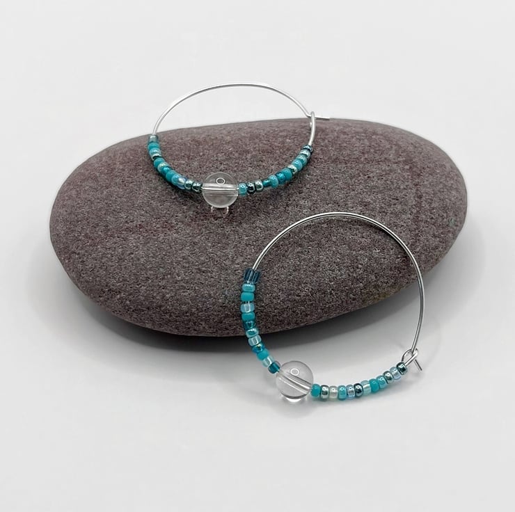 Larger sterling silver hoop earrings with a clear crystal bead and a turquoise mix of tiny glass seed beads.