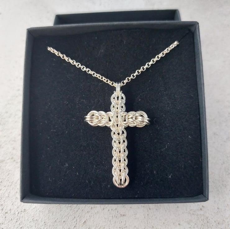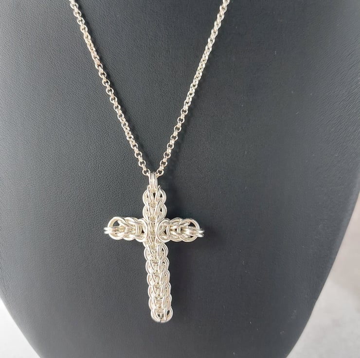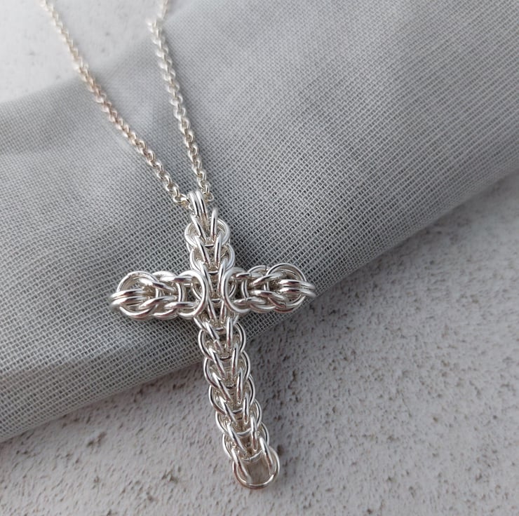 The cross is chainmaille made from individual sterling silver jump rings that are linked together.