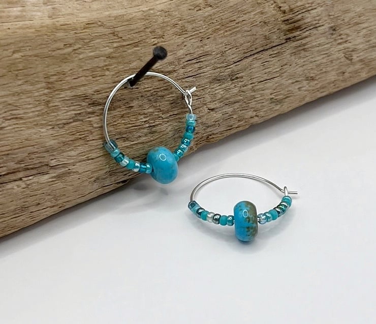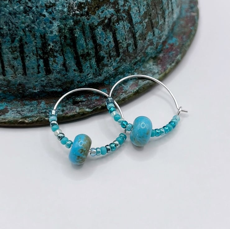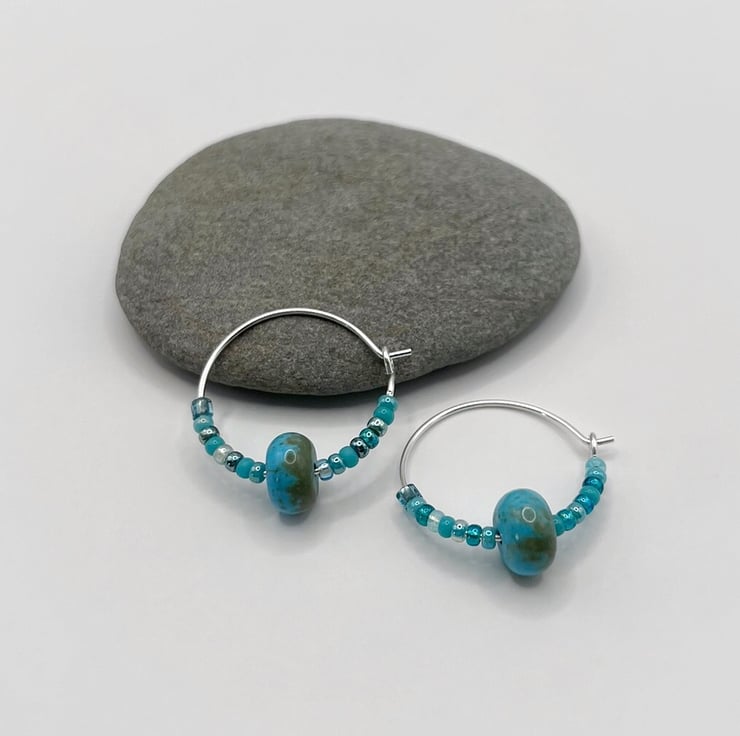 Sterling Silver Hoops with Turquoise Bead and Turquoise Mix Seed Beads - 18mm