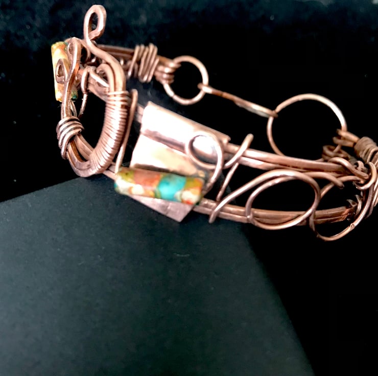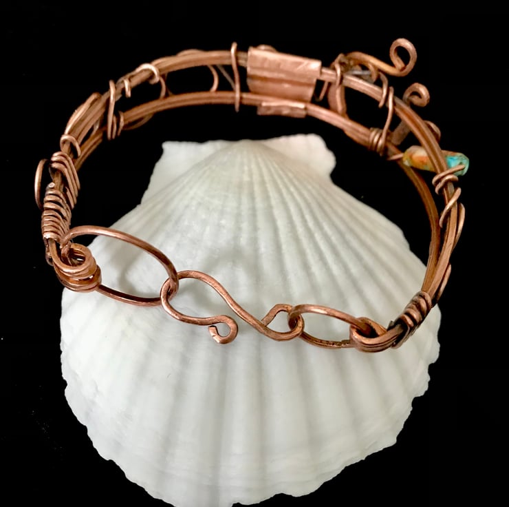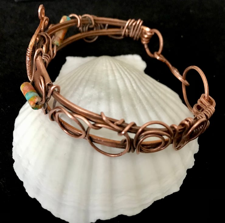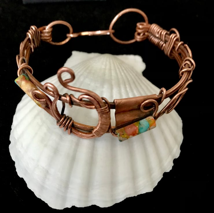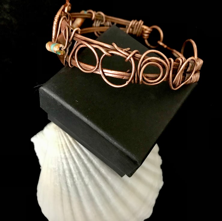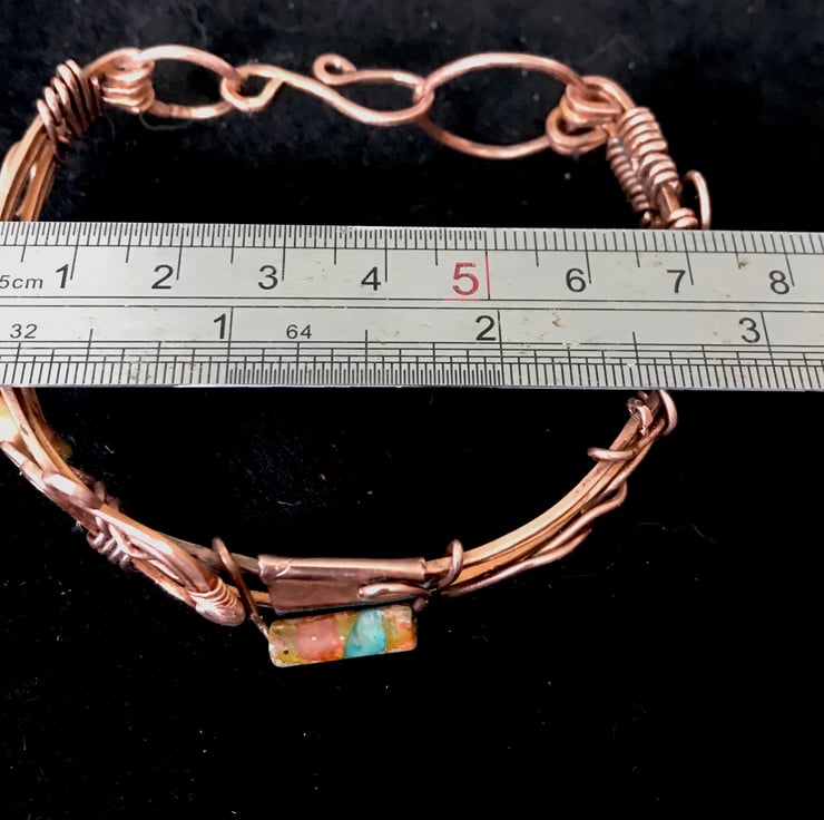 My design is a bohemian style bangle. The oxidisation process involves applying liver of sulphur along with several other steps prior to its final polish. It achieves a beautiful colour however on this occasion it didn’t achieve the dark colours I expected. I have polished to highlight the copper but I would say it is more lightly oxidised hence being put in the perfectly imperfect range. I have added 2 Imperial Jasper tube beads which add a flash of colour. An extremely robust bracelet made with 1.25mm square jewellery wire x 4 for the body of the bangle. Square jewellery wire is the stronger than round wire therefore this bracelet is suitable for daily wear and will most certainly last a lifetime. I am also offering the bangle at over half discount so a real bargain, not many things will last a life time for such a bargain price.
