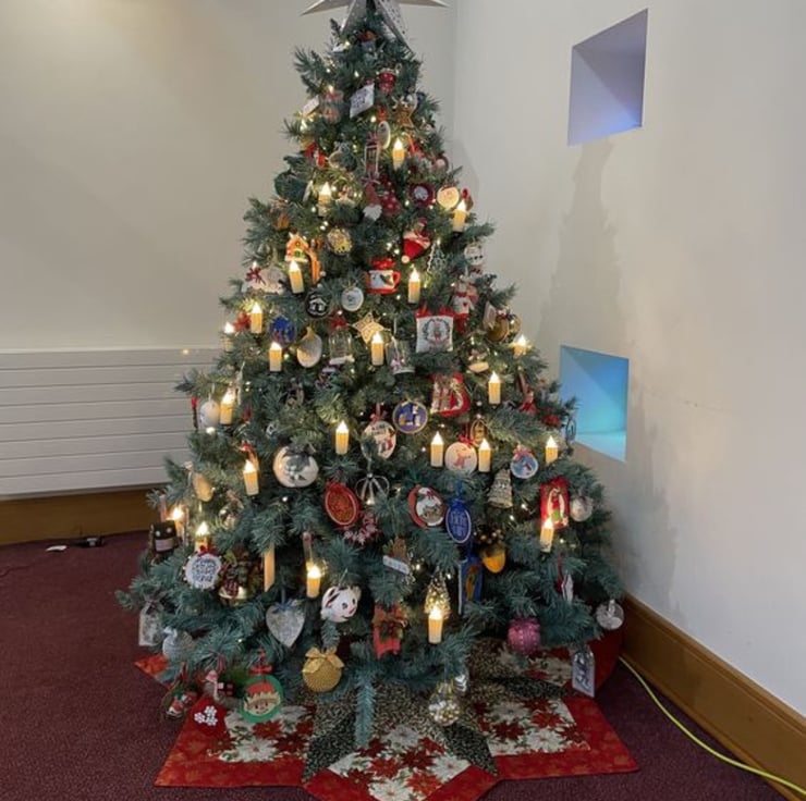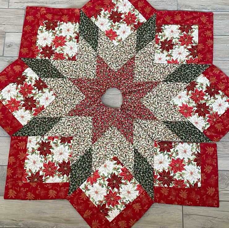 A beautiful handmade patchwork star design Christmas tree skirt featuring bright poinsettia and coordinating holly fabrics in red, green and cream. Each star measures approximately 27ins from point to centre of the skirt. Skirt is split to allow easy wrap around the tree. Made with high quality cotton quilting fabric with gold coloured detail and reverse is red cotton fabric. Wadding is high quality cotton bamboo blend. Decorated tree shown in second photo is approximately 7ft to provide scale.