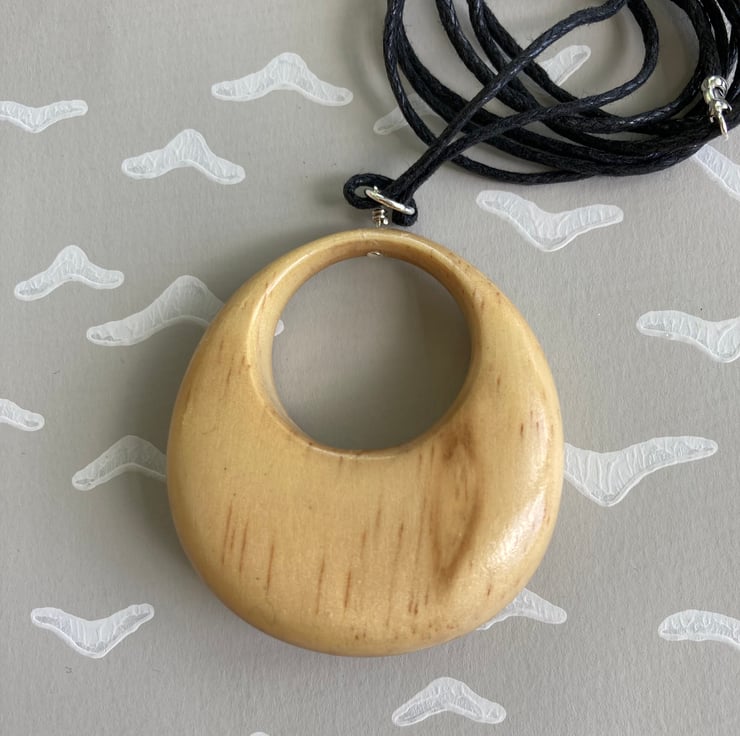 A handmade chunky wooden pendant with a hard wax satin polish. I'm not sure what wood this is but I'm guessing pine because of the light colour and weight. The grain grain is quite close and delicate. The pendant is roughly egg shaped, gently tapering in thickness towards the top with an offset hole. The outer edges are rounded giving it a smooth feel.