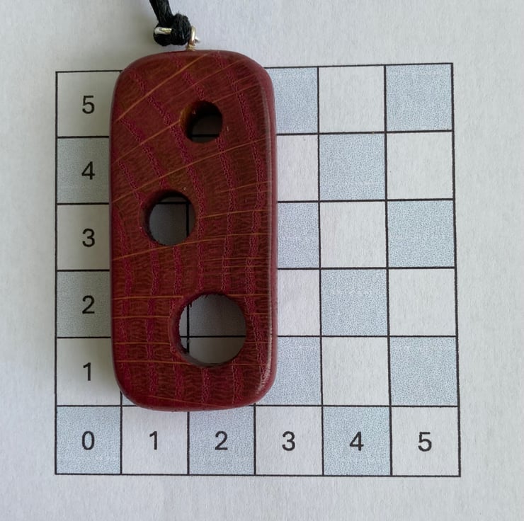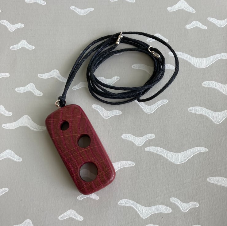 A handmade wooden pendant using oak with a pink stain with a hard wax satin polish. The stain gives it a unique look which highlights the rays in the oak. The pendant is rectangular, roughly 5cm x 2.2cm x 0.8cm. It has three different sized off centre holes and gentle rounded edges.