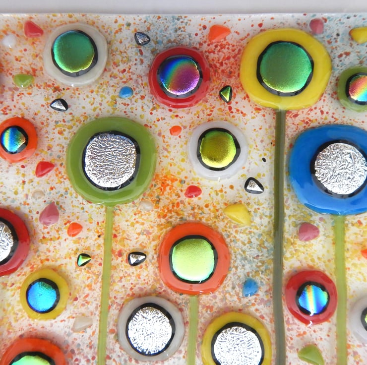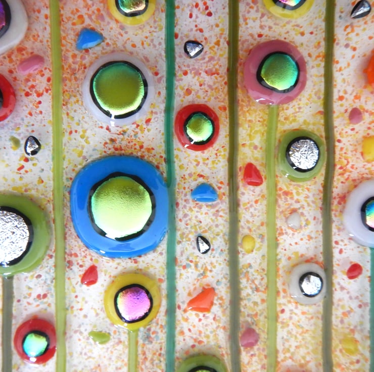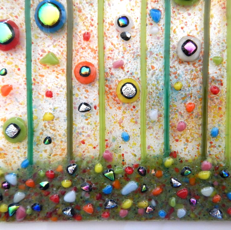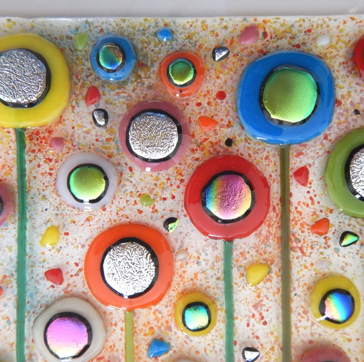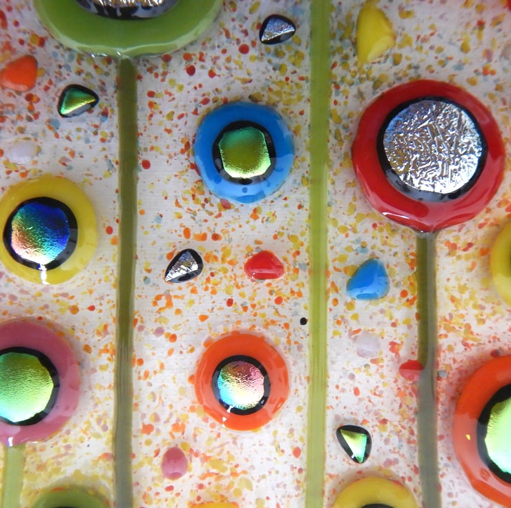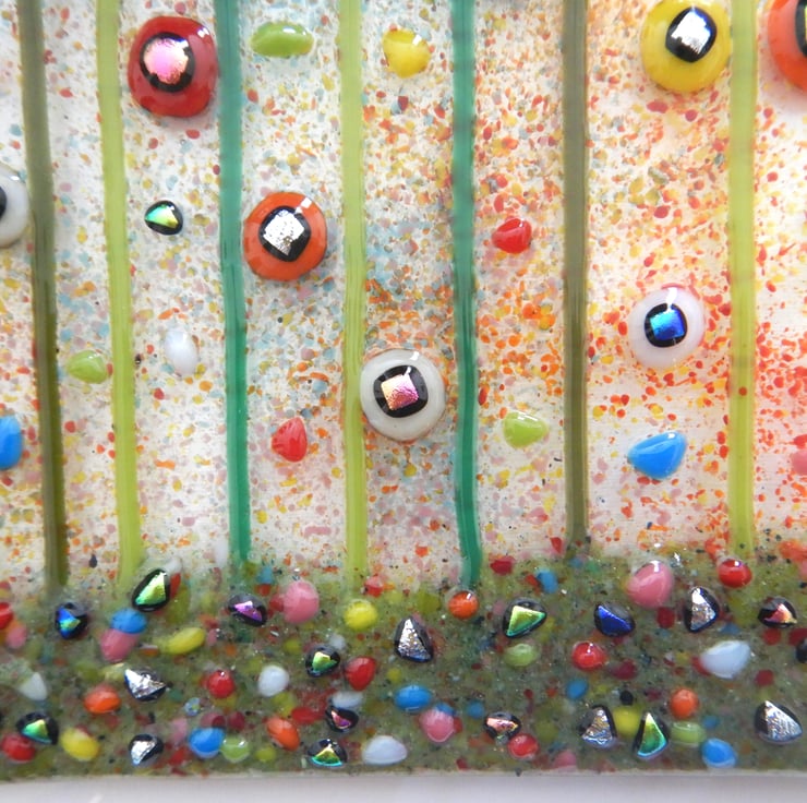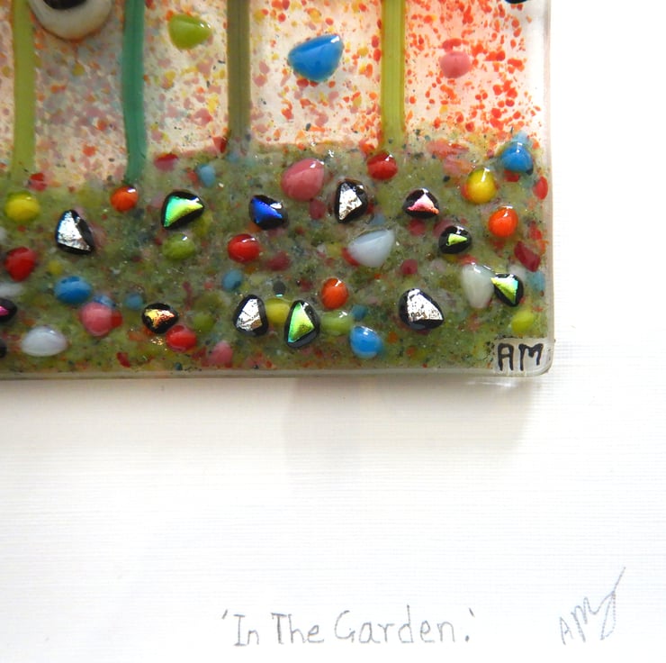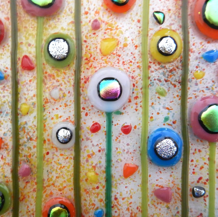 This picture has been made with extreme enthusiasm. It is almost a frenzy of colour and organised chaos. I endeavoured to squeeze in as many flowers as I could without making it too busy. I have used a variety of different glass types and techniques: glass sheet, glass stringers, frit, dichroic glass, millefiori beads, and enamelling.