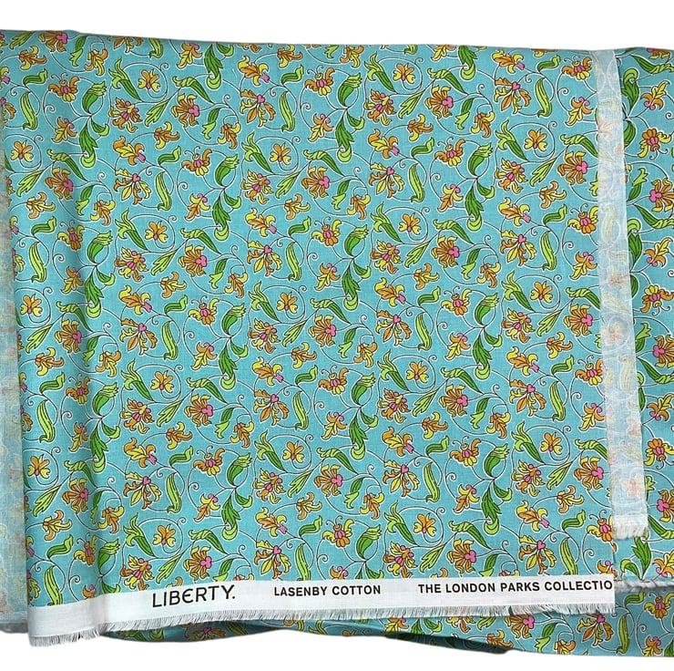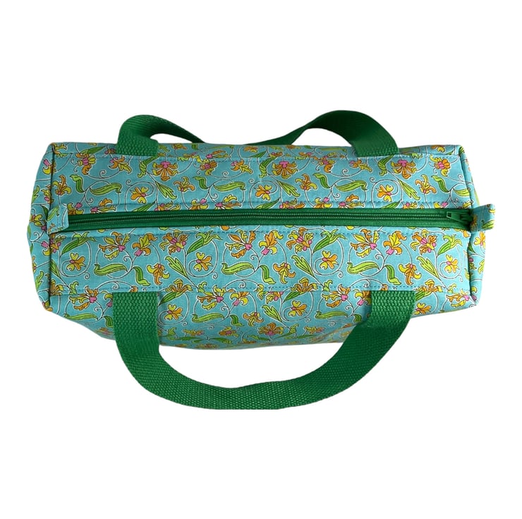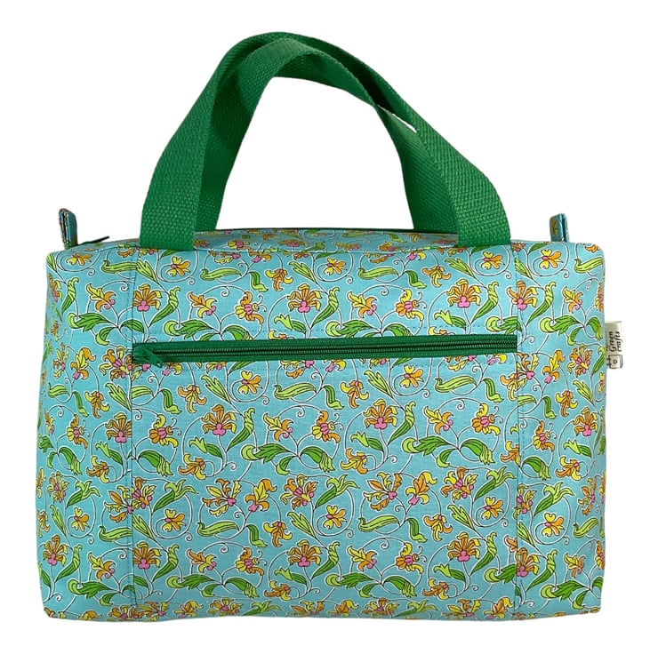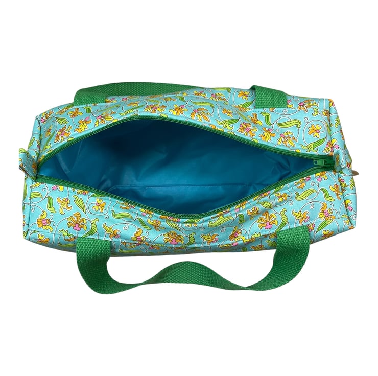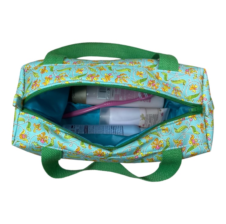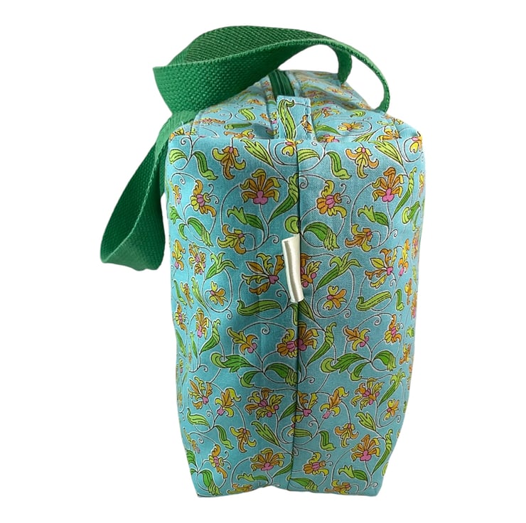 This large boxed bag is made from Liberty’s Lasenby cotton fabric, a quality hard wearing fabric from their “London parks collection” the focus of this toiletries bag is its pretty spiral surrounded floral print on a light turquoise background. The bag is a large sized washbag that would work equally well as a very large cosmetics bag, or for many other uses. I have filled the bag with full size toiletries and there is still plenty of space left.