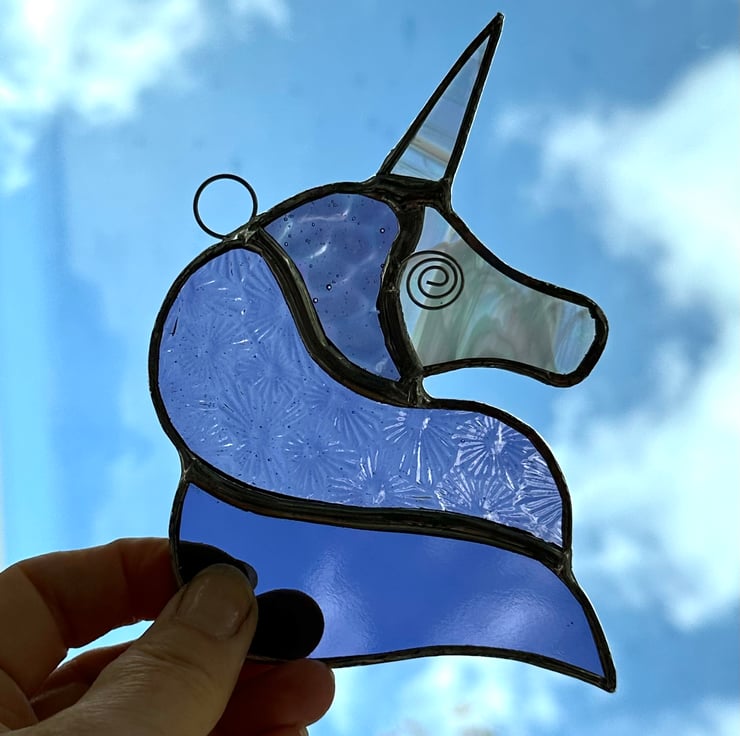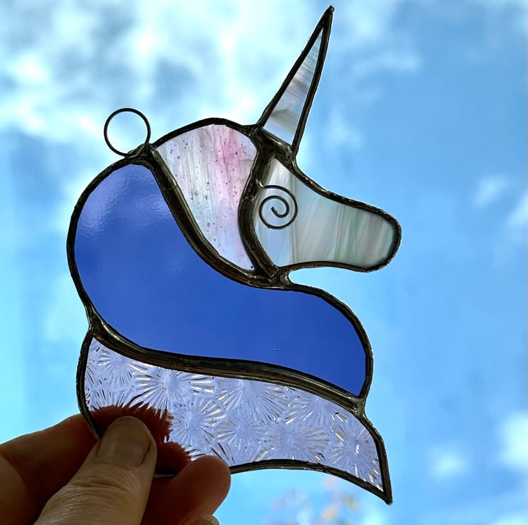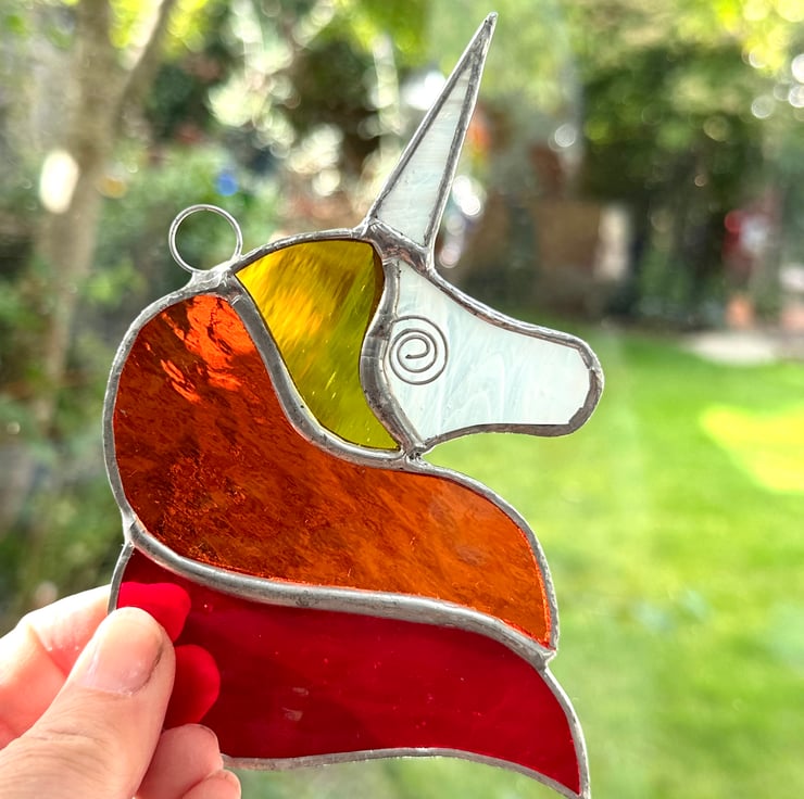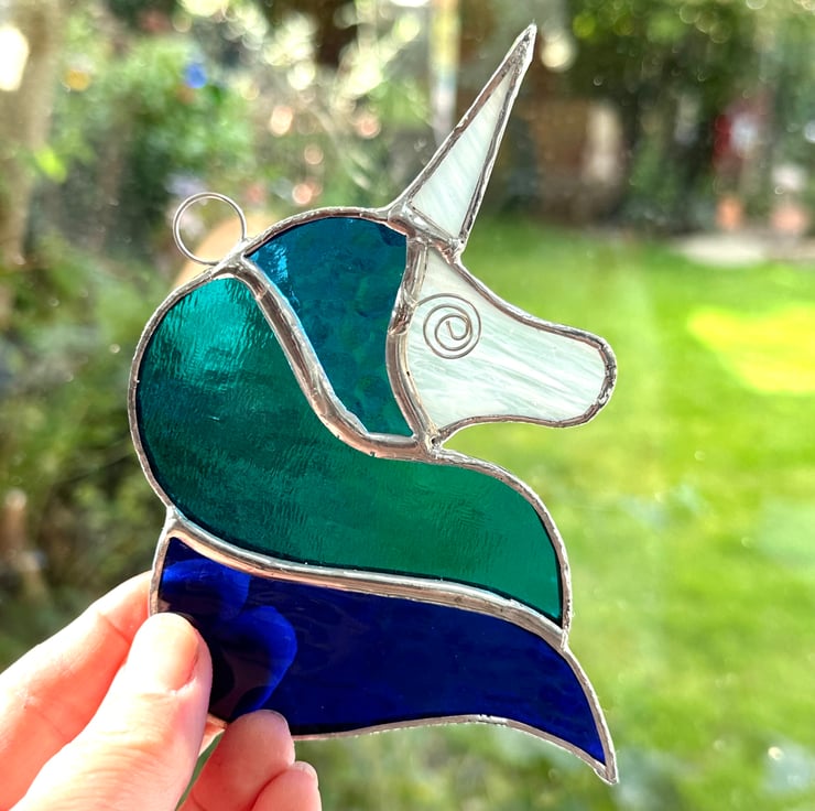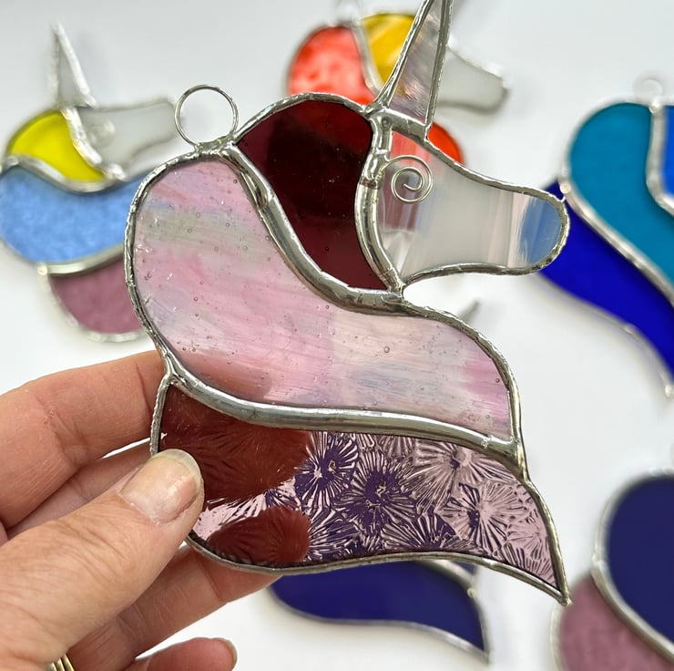 Unicorn suncatcher made in beautiful stained glass by Carole’s Glass.
