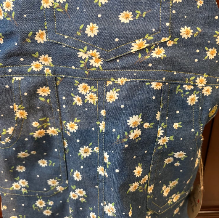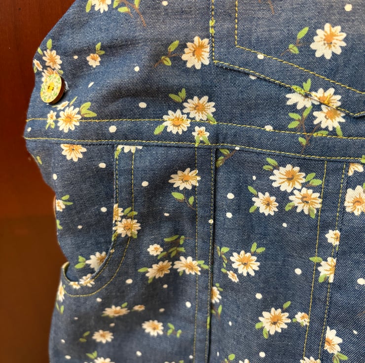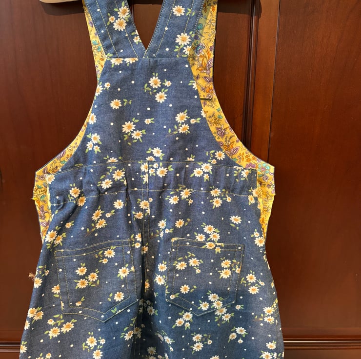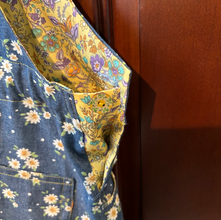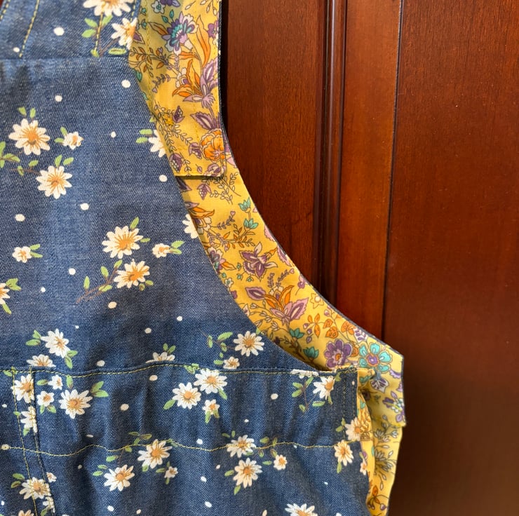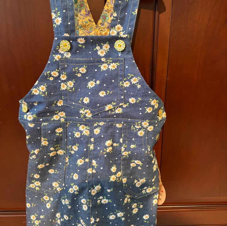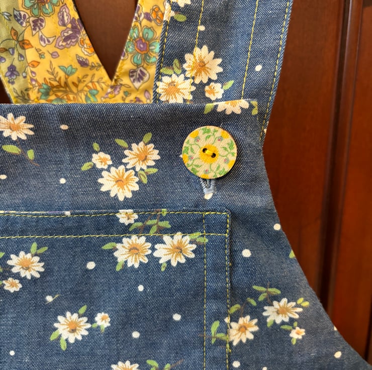 This pinafore dress is made of a very soft lightweight printed denim fabric. It’s very soft to touch. The yellow daisy in the fabric is enhanced with the yellow print facings. Making a very pretty combination.