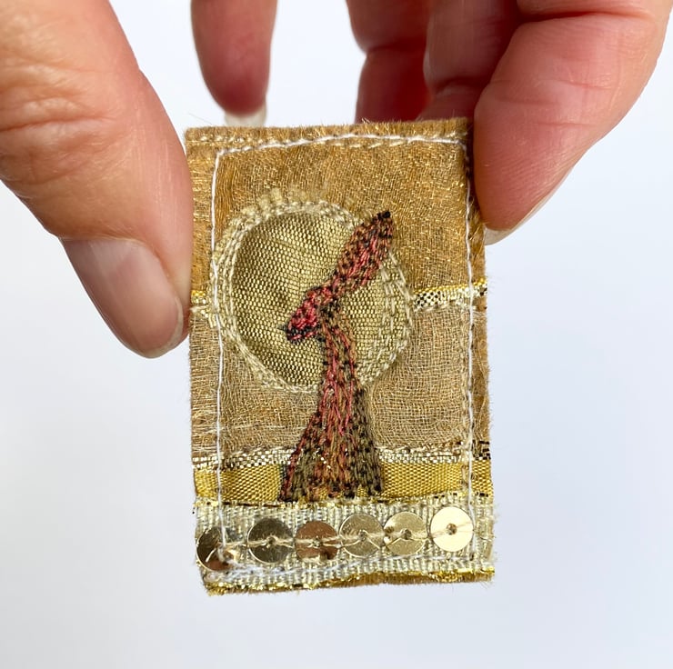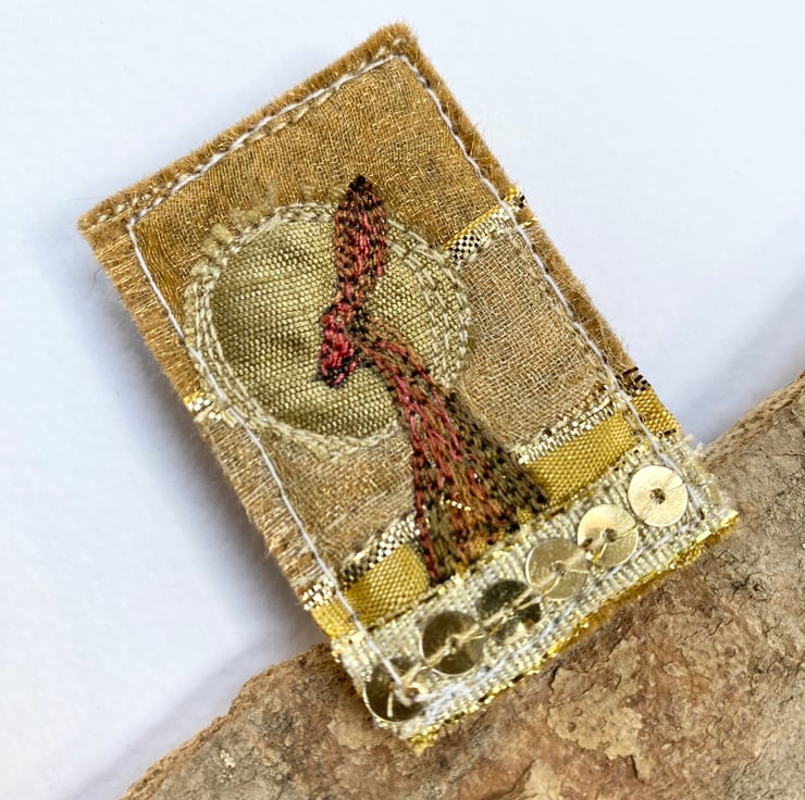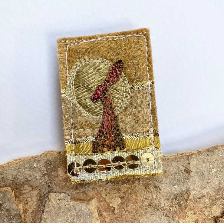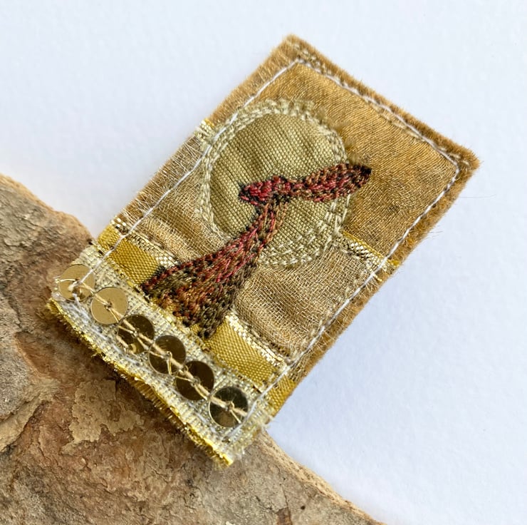 This adorable handmade free motion embroidered harvest sunset hare brooch is made from up-cycled pre felt. It is felt backed, and has a brooch pin with hook on the reverse to keep it nice and secure. It measures 6 x 4cm approx.