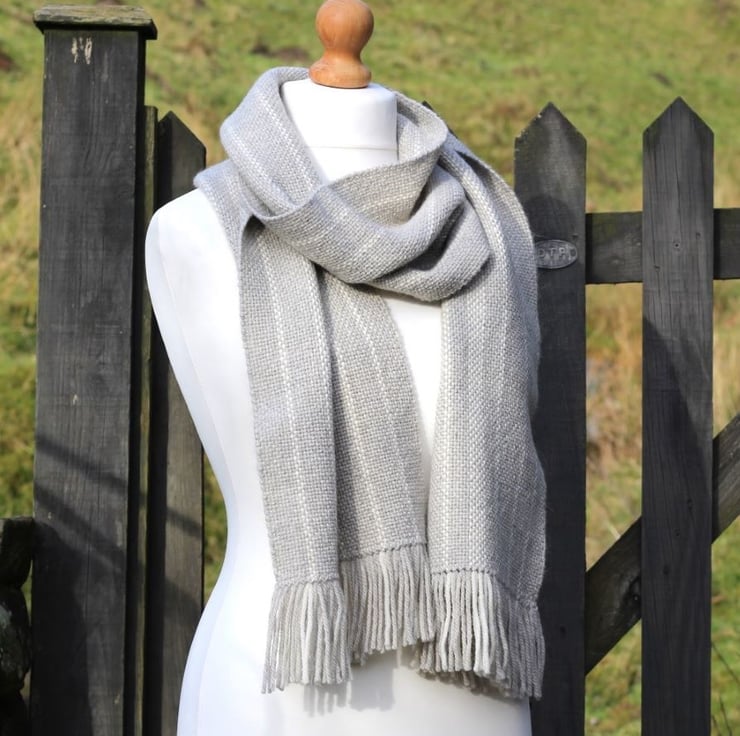 I have woven this scarf from a wool/Alpaca mix yarn by hand on my Ashford loom. The main colour is an undyed natural beige and there are subtle stripes of cream.