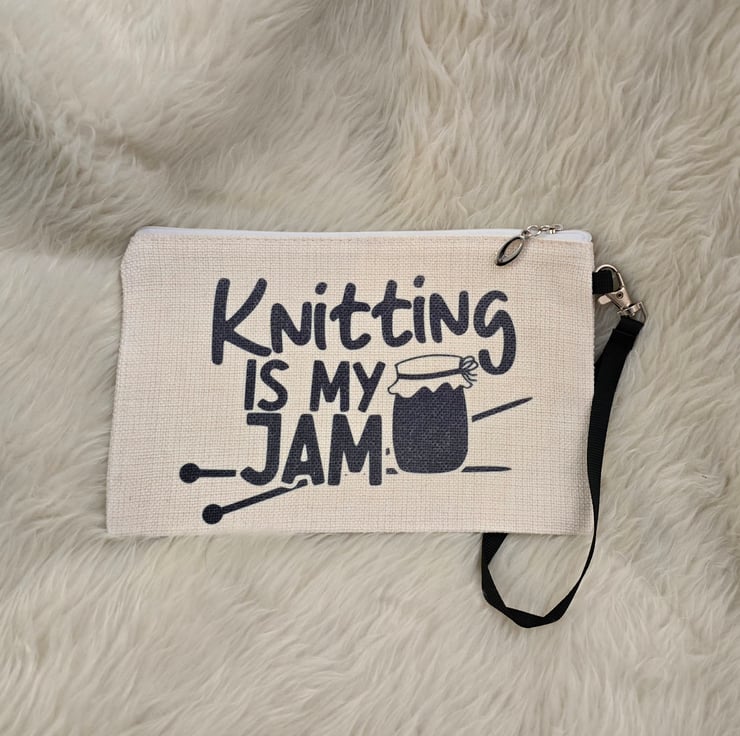 This is a lovely little bag suitable for those small knitting projects like a pair of socks, or a pencil/make up case. (shown in picture fitting a 100g ball of yarn) It has a handy detatchable wrist strap, made from linen and measures 10 cm x 15cm.