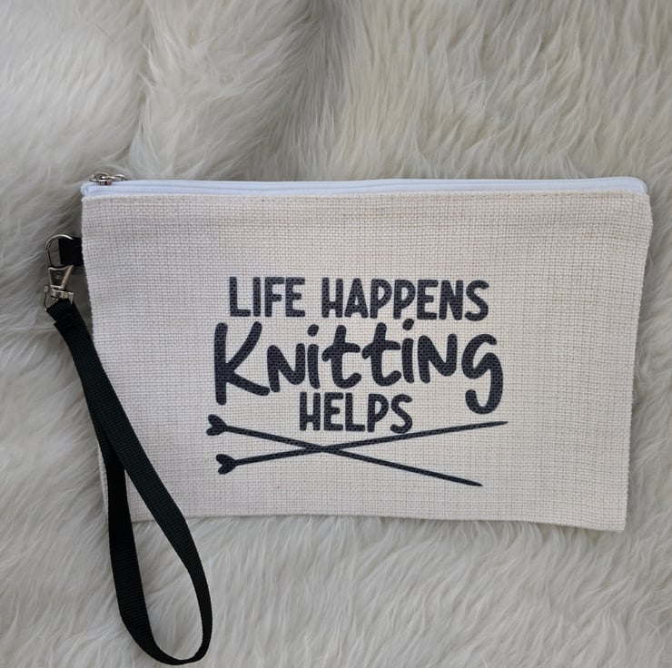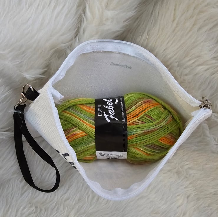 This is a lovely little bag suitable for those small knitting projects like a pair of socks, or a pencil/make up case. (shown in picture fitting a 100g ball of yarn) It has a handy detatchable wrist strap, made from linen and measures 10 cm x 15cm.
