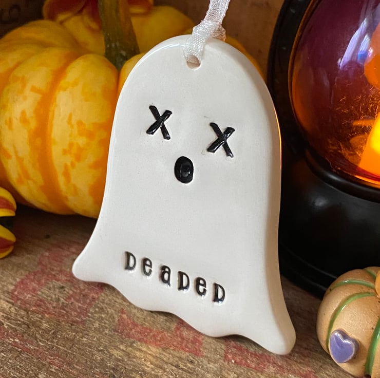 This ceramic ghost decoration has been made from white earthenware clay to my own design. Blargh, he's definitely carked it! It has been fired twice and finished with a clear, glossy glaze. Glazed on the front only. It measures 6cm x 5.5cm x 1cm deep and hangs from a cream organza ribbon.