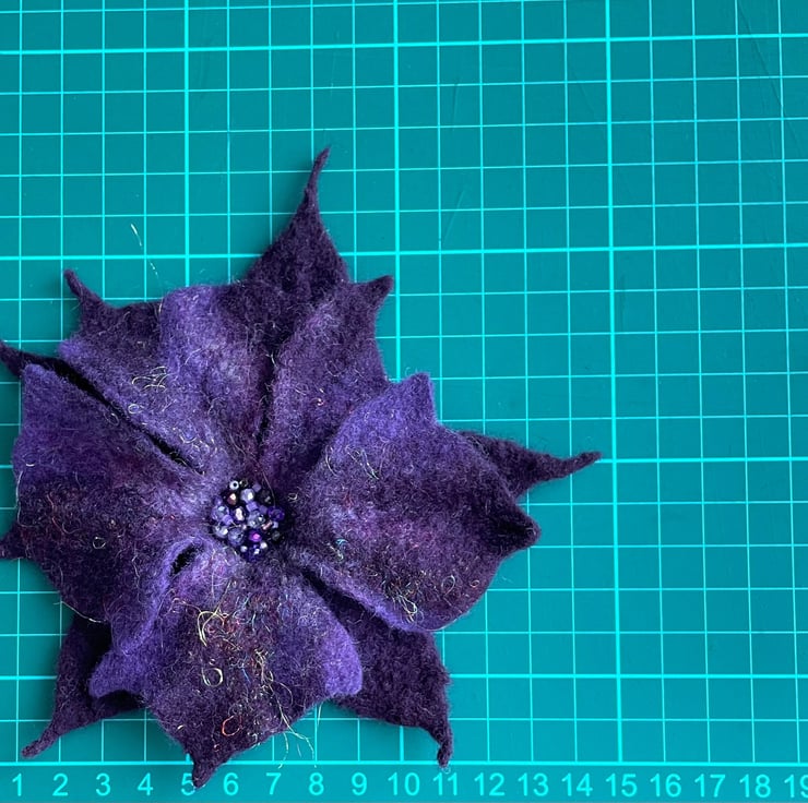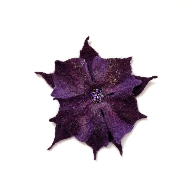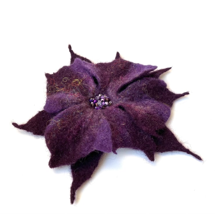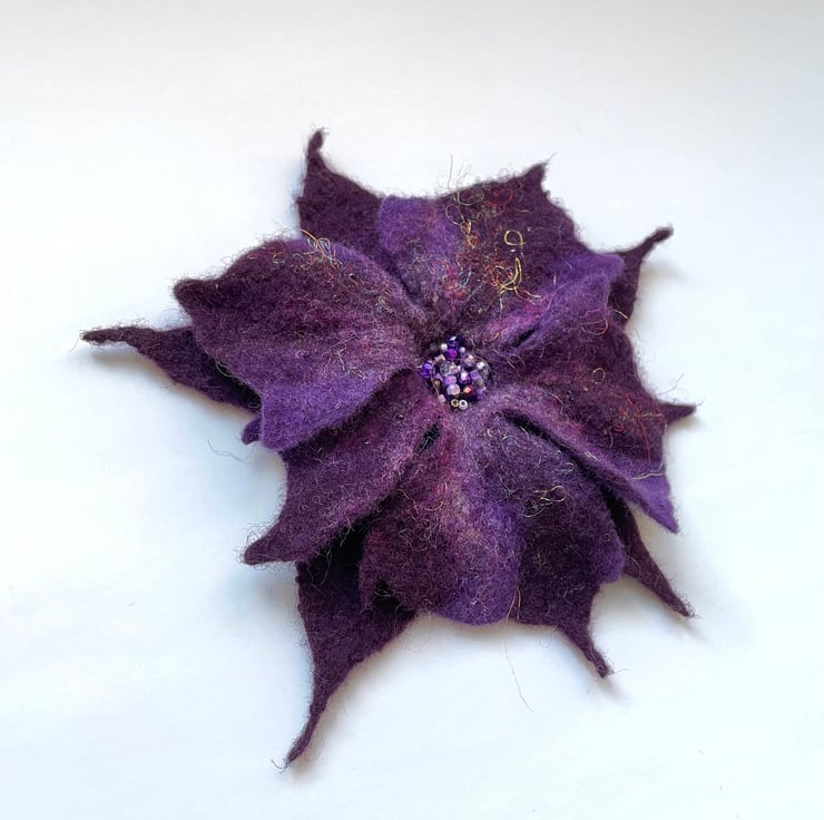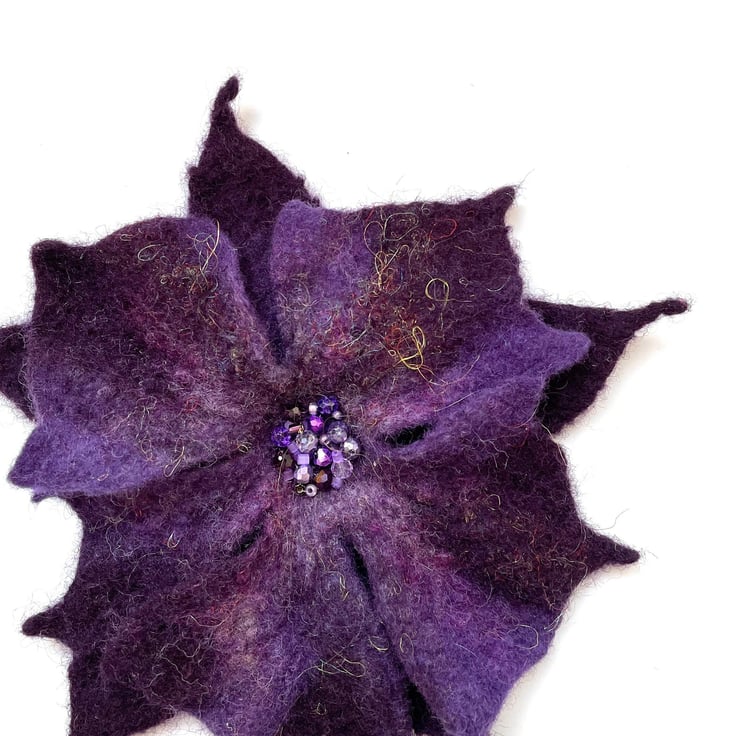 The flower brooch is handmade by me in wet felting technique with gentle olive soap and warm water. It is made from merino wool, silk fibres and beads.