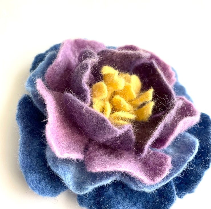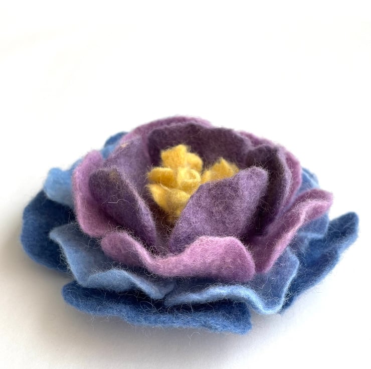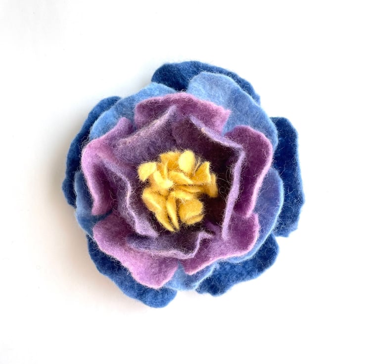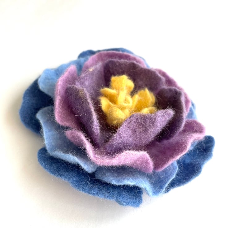 The flower brooch is handmade by me in wet felting technique with gentle olive soap and warm water. It is made of merino wool.