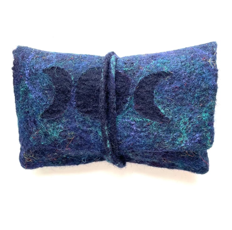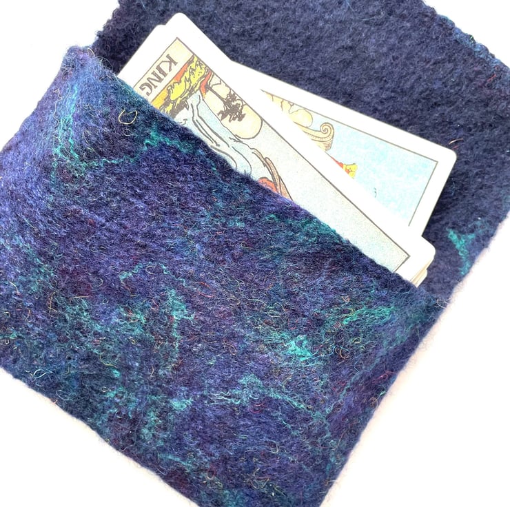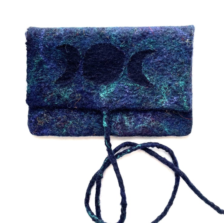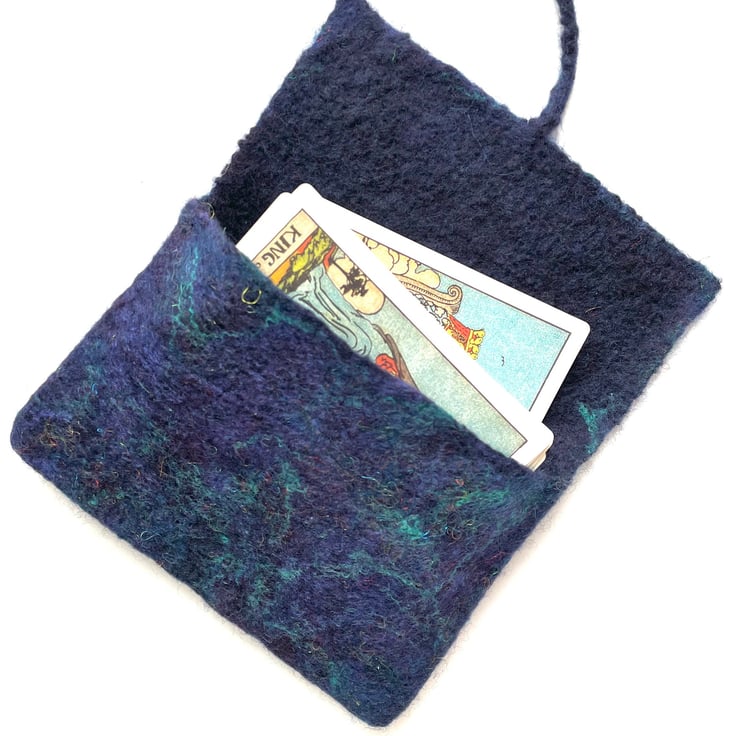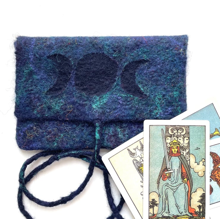 The tarot card bag made from merino wool decorated with silk and bamboo fibres.