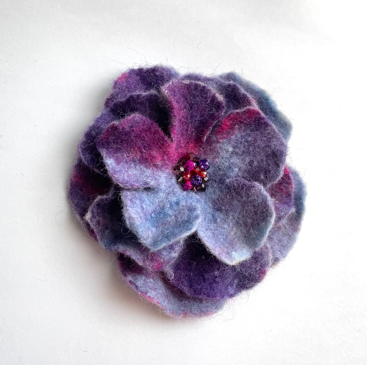 The flower brooch is handmade by me in wet felting technique with gentle olive soap and warm water. It is made of merino wool.