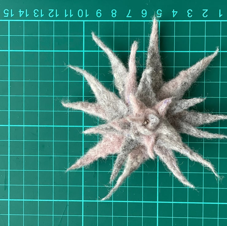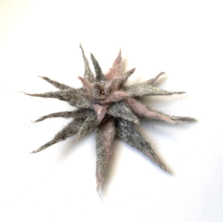 The flower brooch is handmade by me in wet felting technique with gentle olive soap and warm water. It is made of merino wool and silk fibres.
