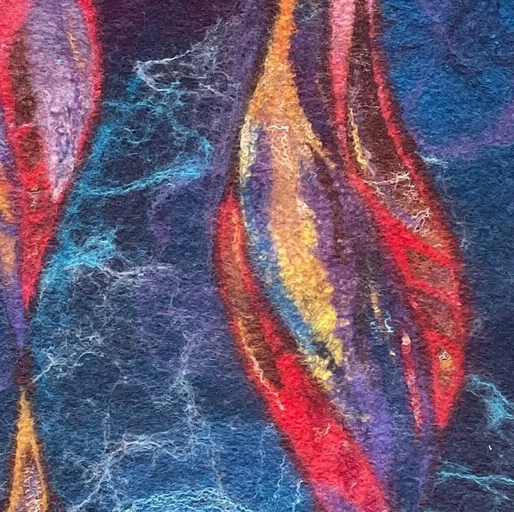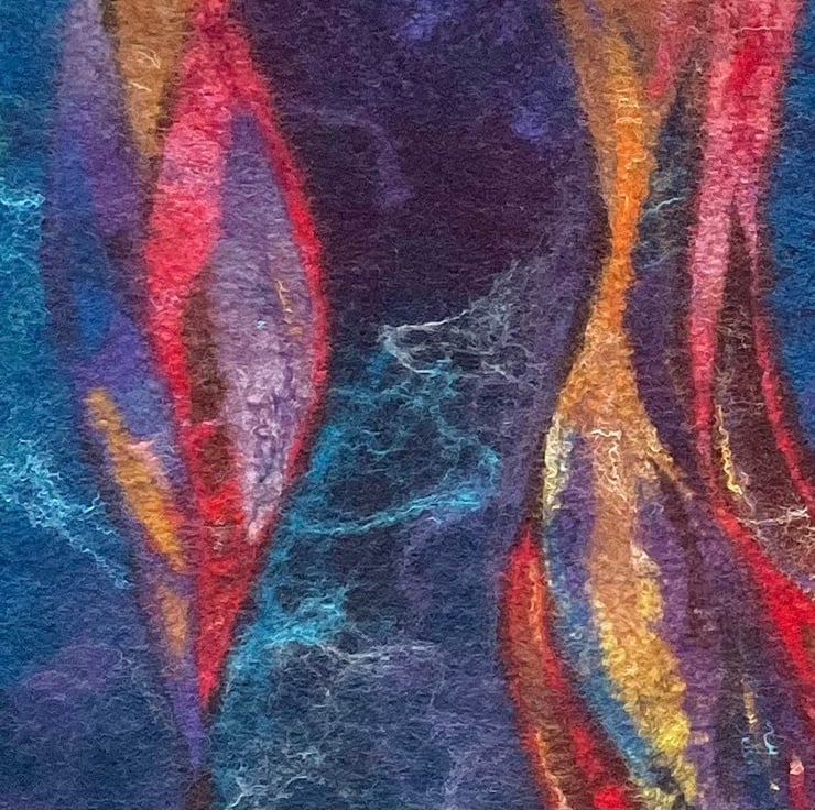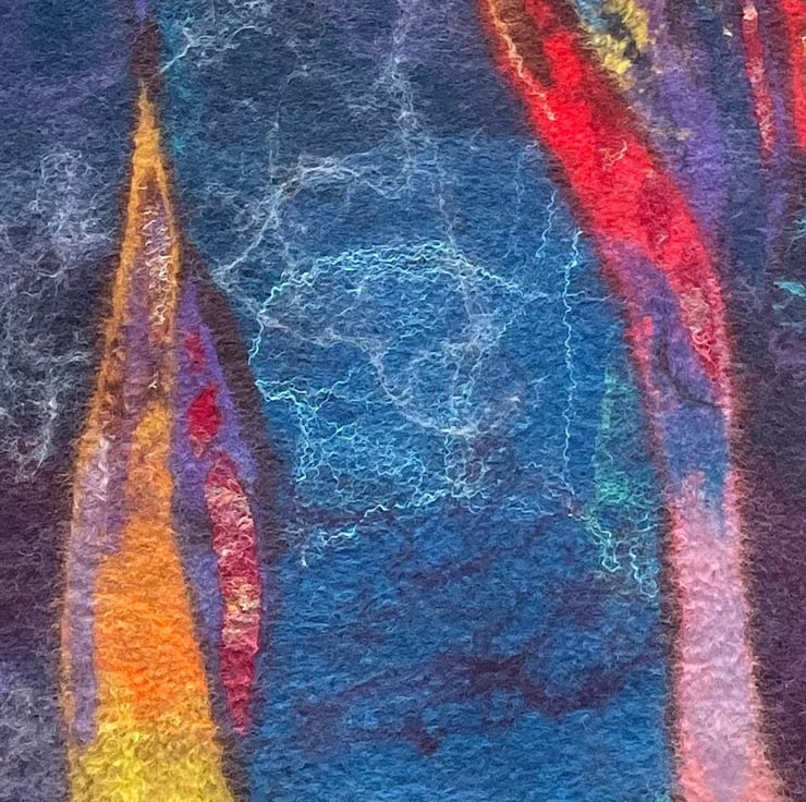 The painting is wet felted by hand using various colours of merino wool and natural fibres.