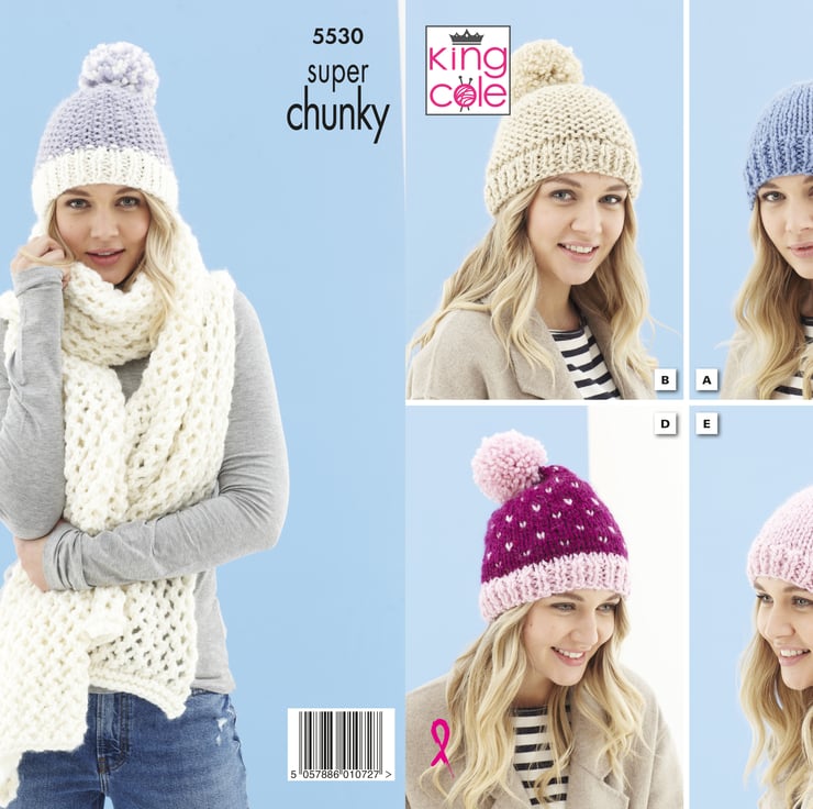 Knitting Pattern - King Cole Super Chunky Knitting Pattern 5530 - Hats and Scarf