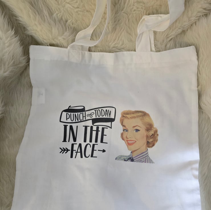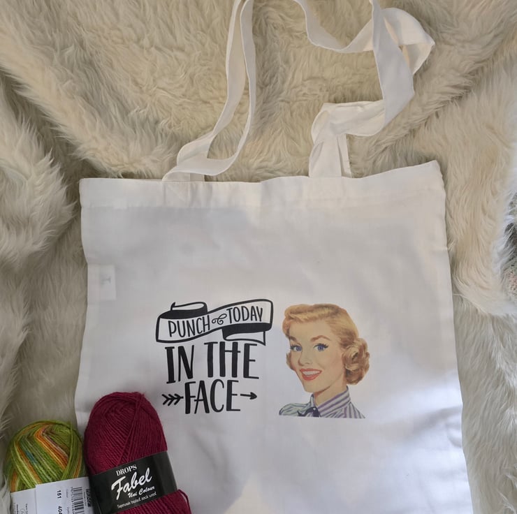 Cute and sassy tote, perfect for setting the tone on a trip out into the big wide world where the people are! Or just for storing craft projects.