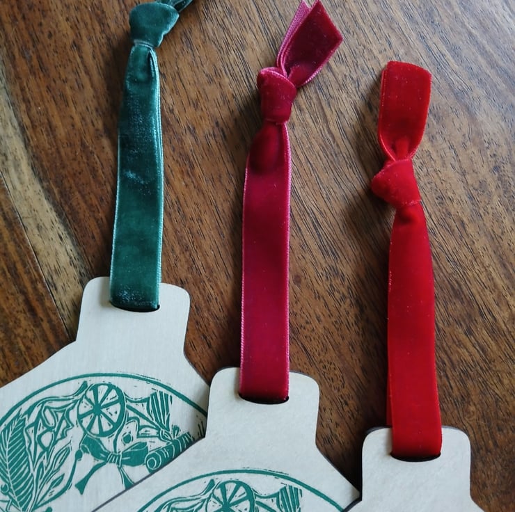 The front of the bauble features a lino print of my original hand-carved wreath design. It has been printed by hand in a festive mid-green oil-based ink, with my maker’s logo stamped in black on the reverse.