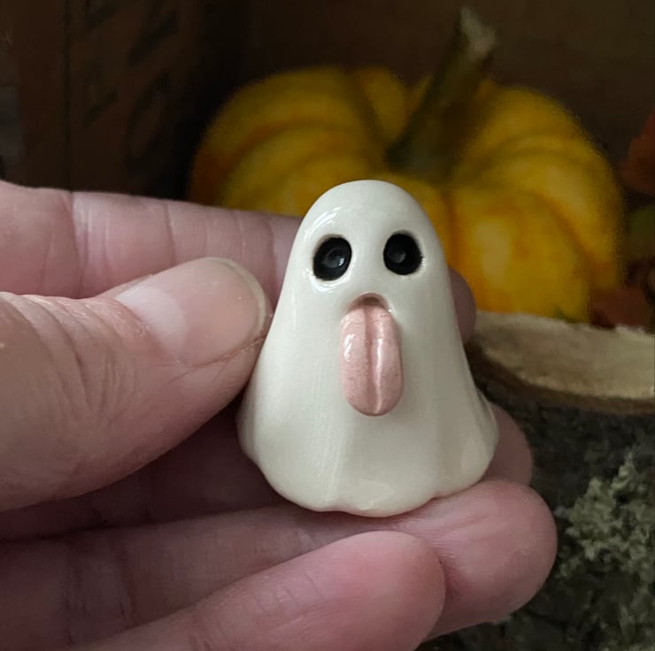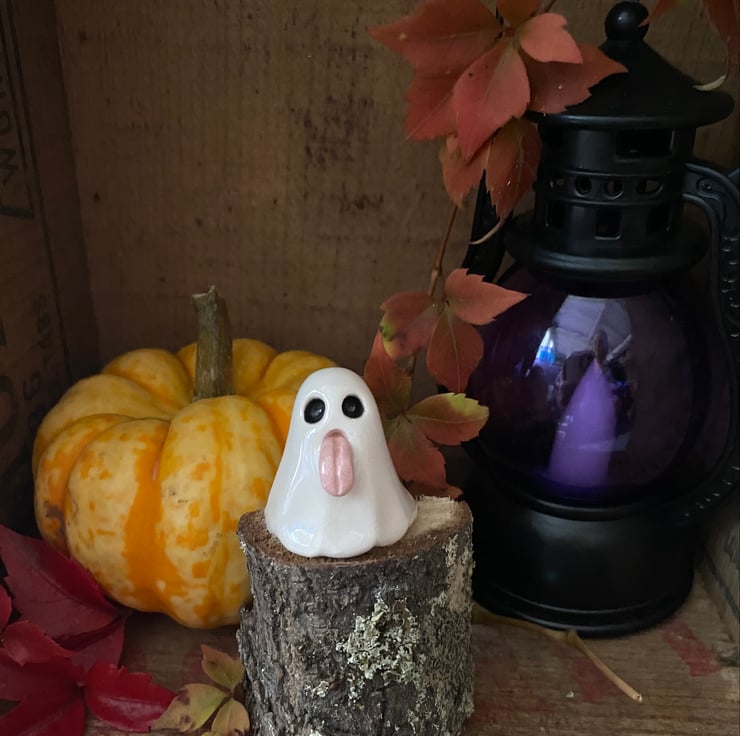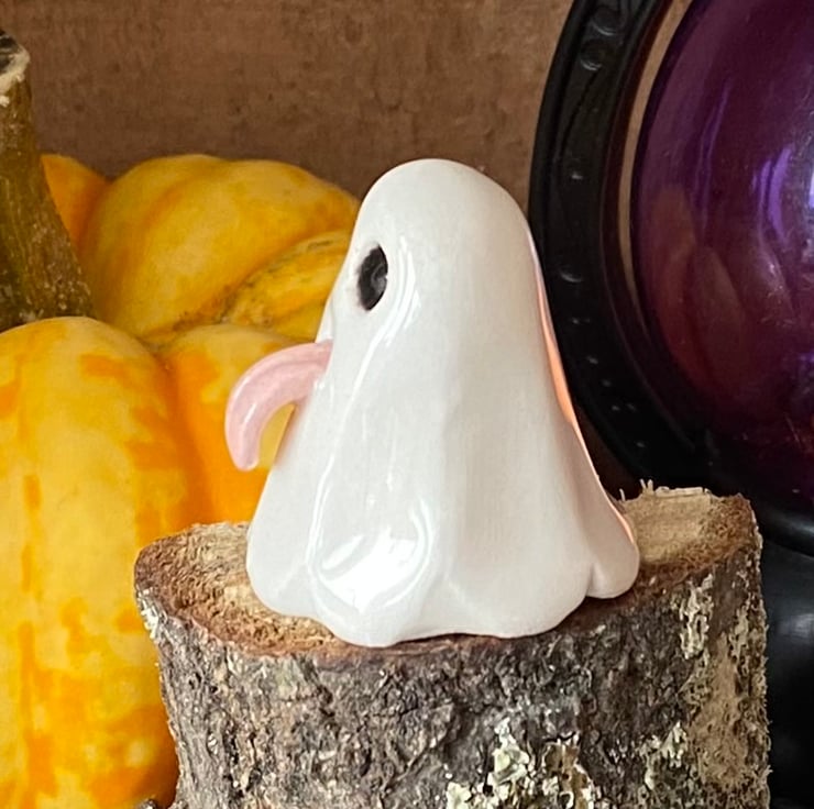 This cheeky, teeny ceramic ghost decoration has been made from white earthenware clay. It has been hand sculpted so no two will be exactly the same (you may not get the one that has been photographed but yours will be equally as cute!) It has been fired twice and finished with a clear, glossy glaze. It measures approx 3cm x 2.5cm