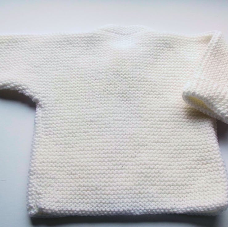 Made to fit 0 to 3 monthes. Actual size chest 48cm (18 inches) and length 26cm (11 inches). Wool wash programme