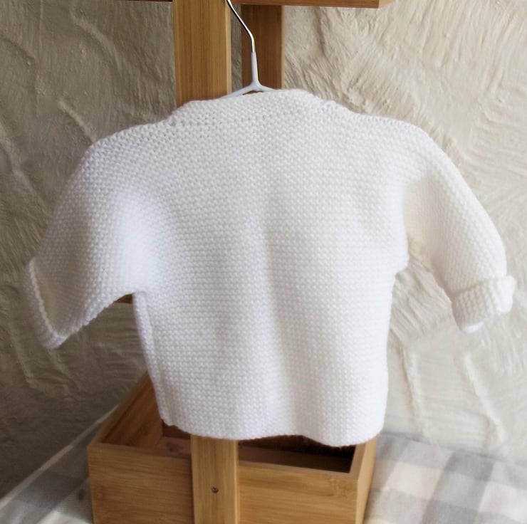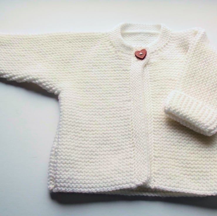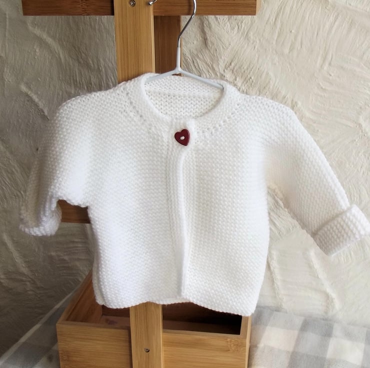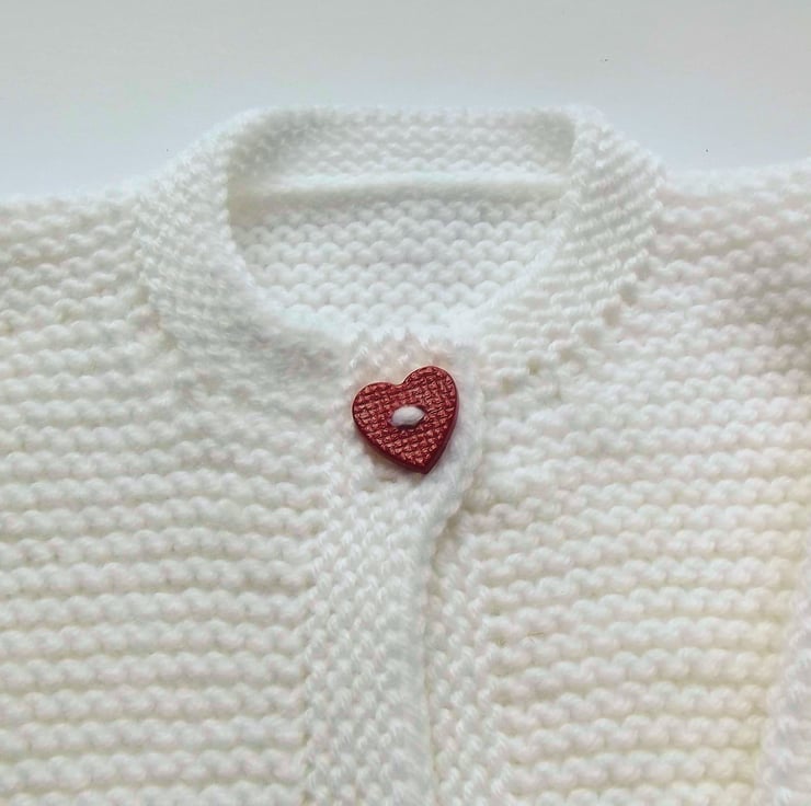 Hand knitted by me. White Cardigan Jacket. Rund neck with 1 heart button closure. Knitted in medium weight acrylic blend yarn. hm57
