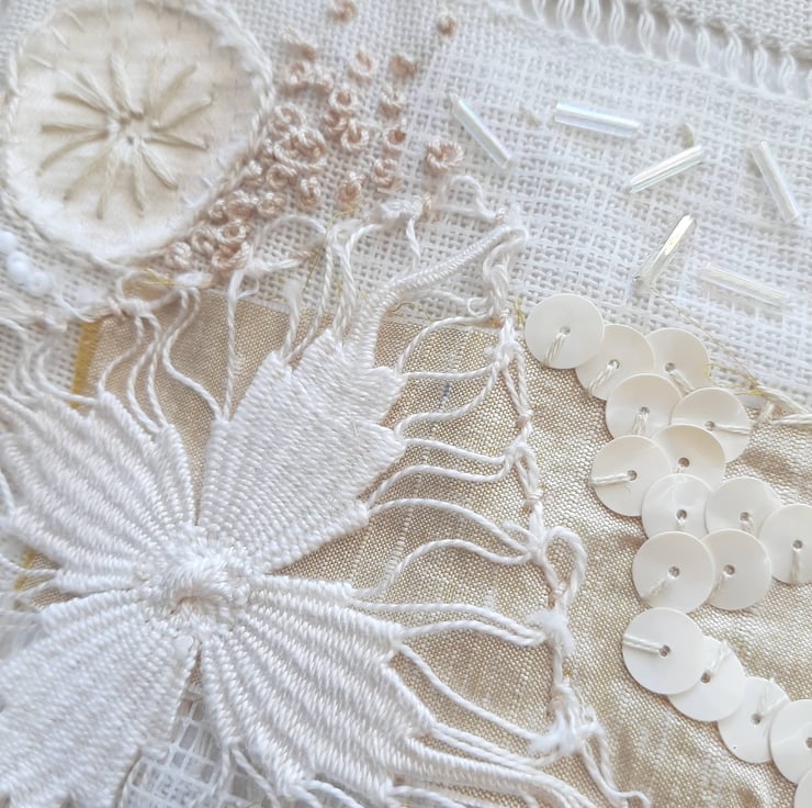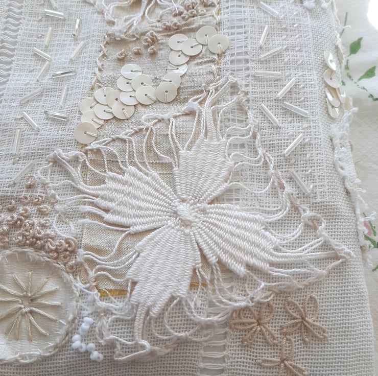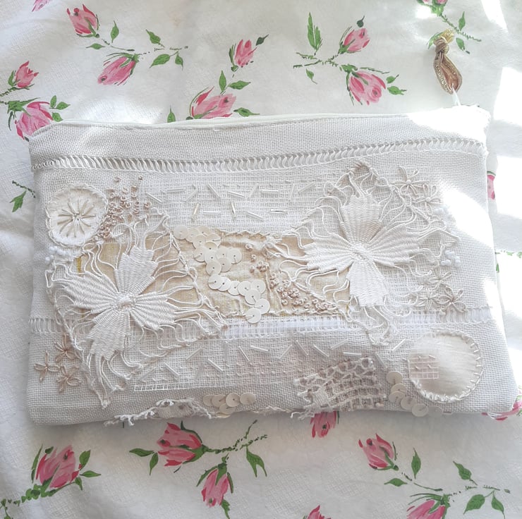 This evening clutch bag has been made from a base fabric of a piece of vintage French tray cloth which has some pulled work as decoration. I have added old crochet doilies and lace motifs and pieces of silk fabric. There is extensive handstitching and beadwork to build up the layers and create the design. I always stitch intuitively so there is no plan or pattern. The bag is lined with repurposed cotton fabric and has a zip closure.