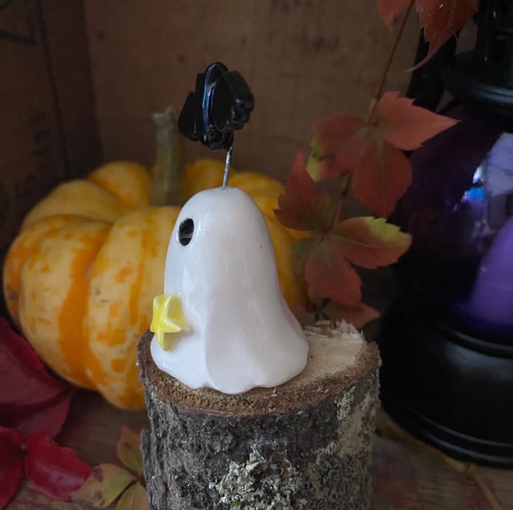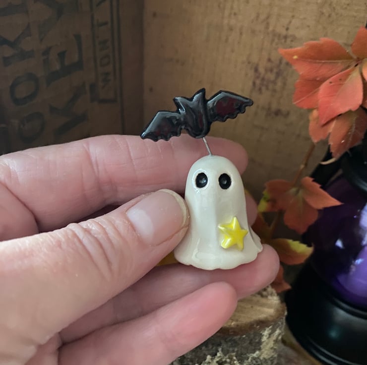 This teeny ceramic ghost decoration has been made from white earthenware clay. This one is called Bats in the Belfry! It has been hand sculpted so no two will be exactly the same (you may not get the one that has been photographed but yours will be equally as cute!) It has been fired twice and finished with a clear, glossy glaze. It measures approx 3cm x 2.5cm