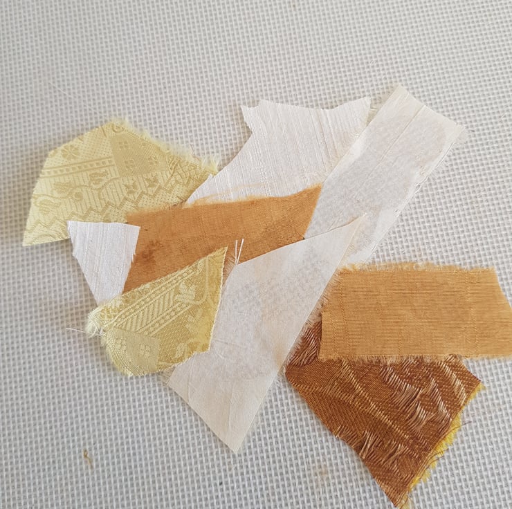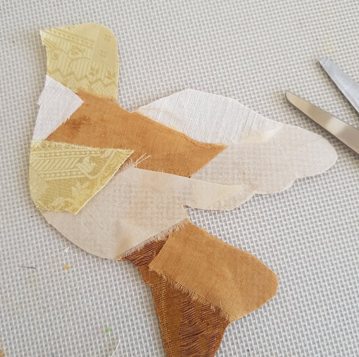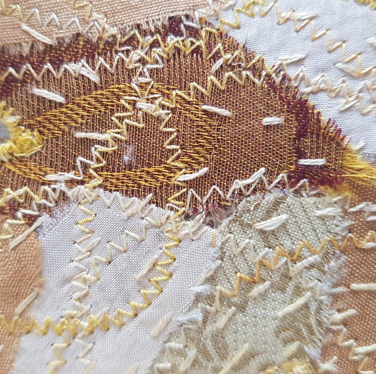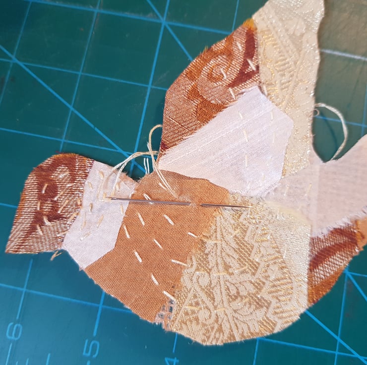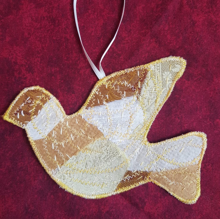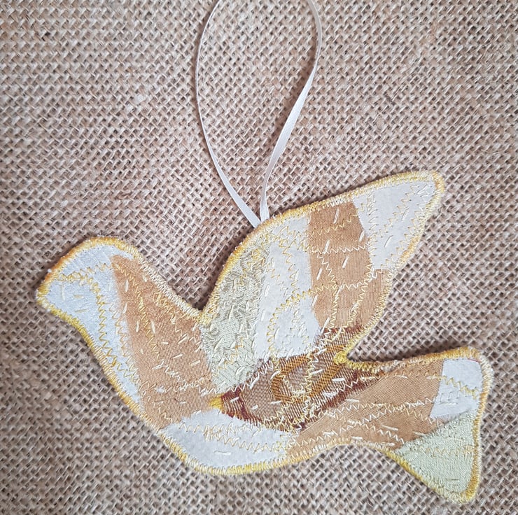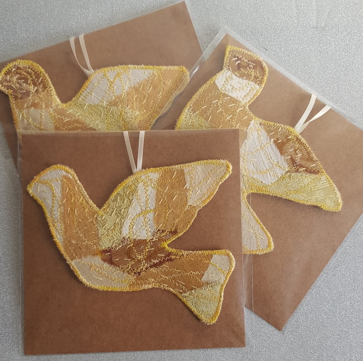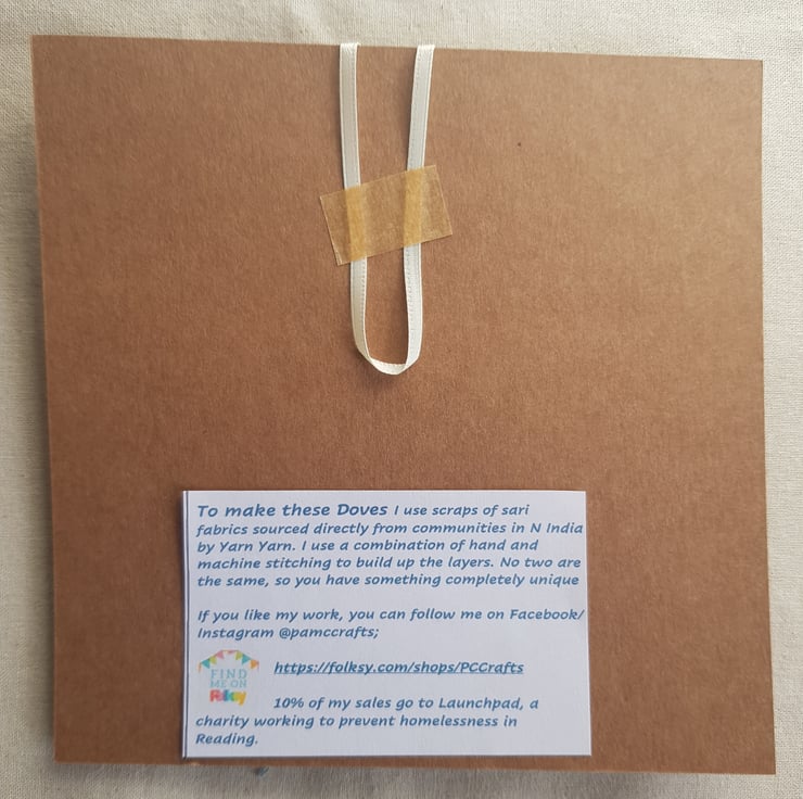These doves are made by applying small pieces of sari silk on to hessian. I then hand stich and machine stitch to build up the layers. They have a layer of wadding and are backed with an Indian block print fabric. These fabrics have a lovely sheen that is hard to capture in the photos.