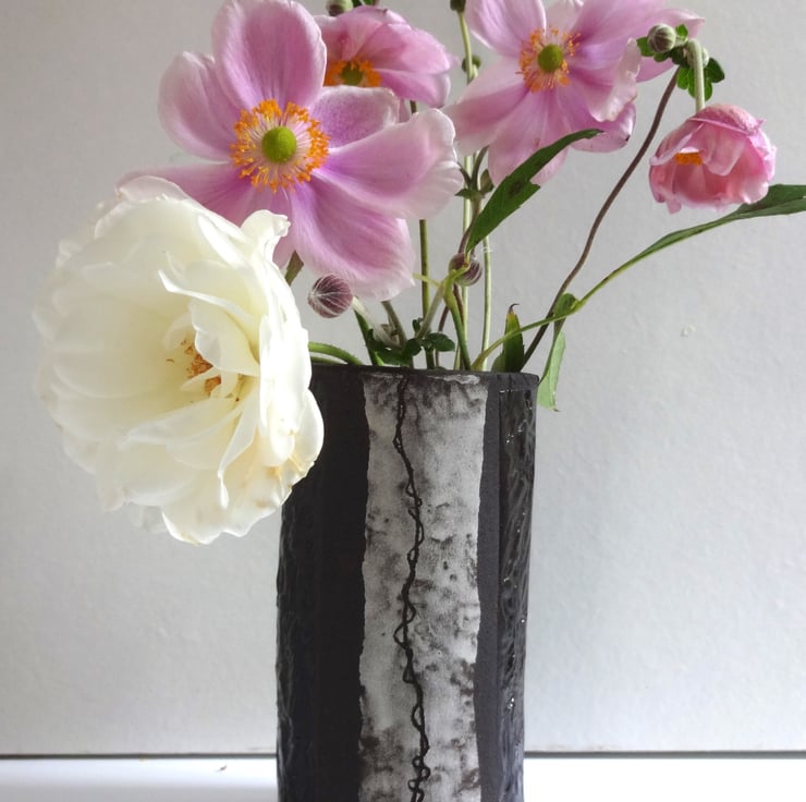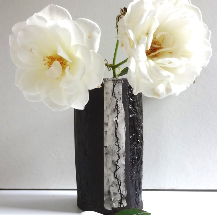 A one-off small handmade ceramic vase for a pretty posy from your garden or country walks. It gives an arty look to your rooms when filled with white flowers to continue the black and white theme, or equally well with bright colours. I made the vase in black stoneware clay and textured some areas of the surface with a peach stone. I created panels of white slip and etched a twining design reminiscent of vine tendrils - this technique is known as sgraffito decoration. The interior and the textured panels are glazed in iron lustre finish with a surface gloss, while the rest of the vase is the natural finish of the black clay itself. 12.5cm high x 6.5cm diameter across the base. The base has my potter’s mark of a swallow in flight impressed into the clay before firing.