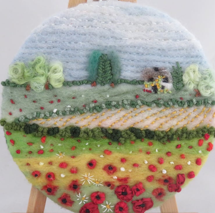 The background of this design has been created by needle felting wool fibres into a scrap of quilt backing. The background has then been stitched to fabric reclaimed from a vintage tablecloth. Details of the design have been added in simple hand embroidery using threads (some of which are vintage) and using vintage 3 ply wool. Poppies in the foreground have been stitched in silk ribbon.