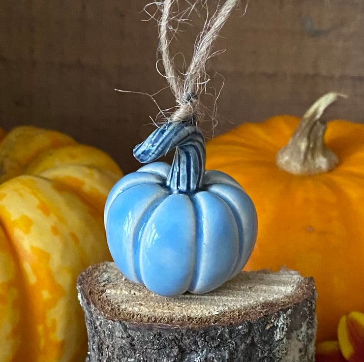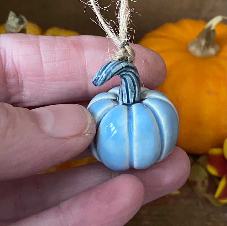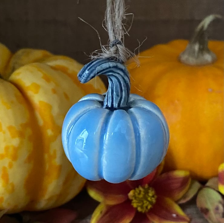 This tiny ceramic pumpkin decoration has been made from white earthenware clay. It has been fired twice and finished with a glossy glaze. It measures 3cm x 2.5cm. Hangs from a brown string.
