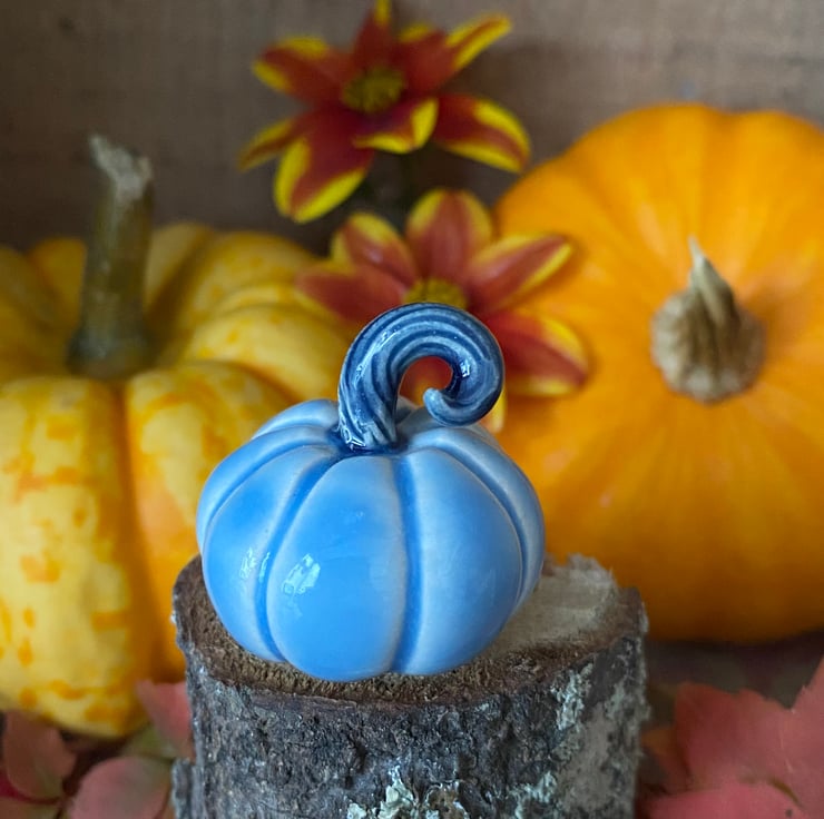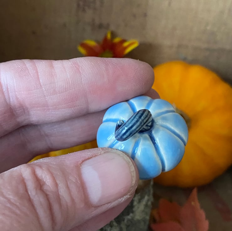 This tiny ceramic pumpkin decoration has been made from white earthenware clay. It has been fired twice and finished with a glossy glaze. It measures 3cm x 2.5cm.
