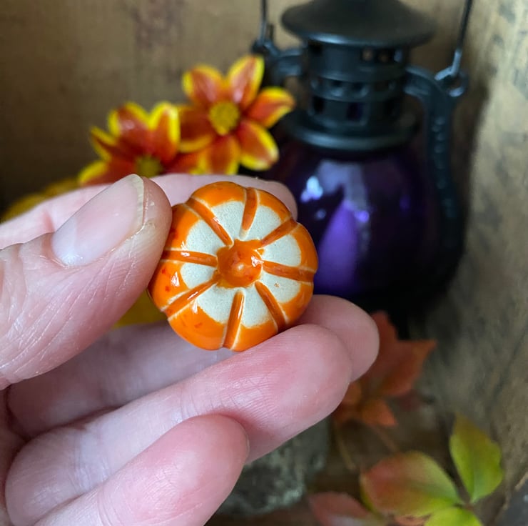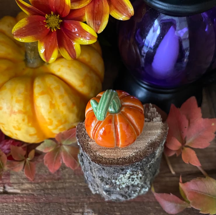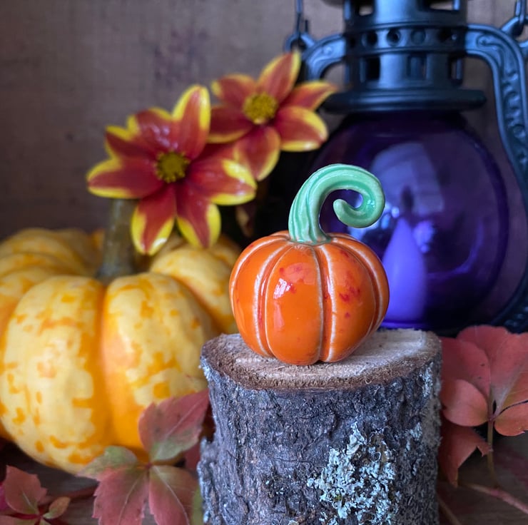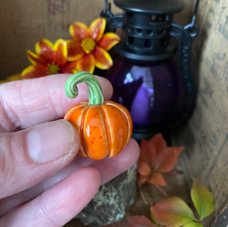 This tiny ceramic pumpkin decoration has been made from white earthenware clay. It has been fired twice and finished with a glossy glaze. It measures 3cm x 2.5cm.
