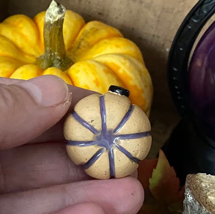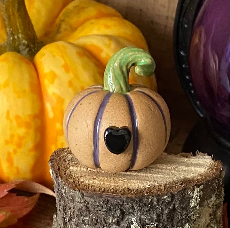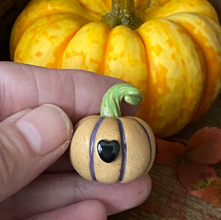 This tiny ceramic pumpkin decoration has been made from white earthenware clay. It has been fired twice and finished with a glossy glaze. It measures 3cm x 2.5cm.
