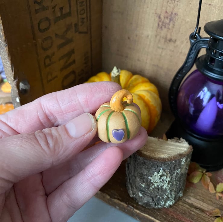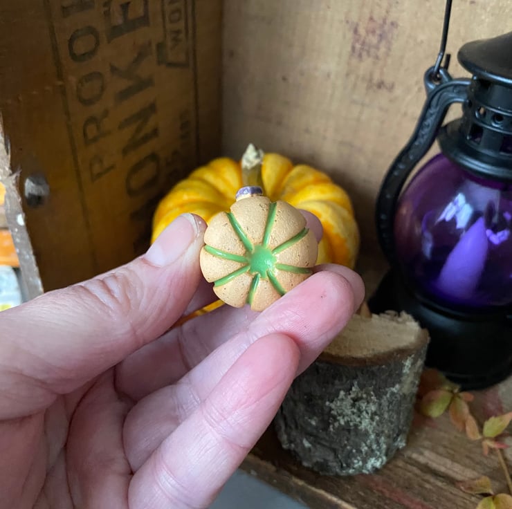 This tiny ceramic pumpkin decoration has been made from white earthenware clay. It has been fired twice and finished with a glossy glaze. It measures 3cm x 2.5cm.