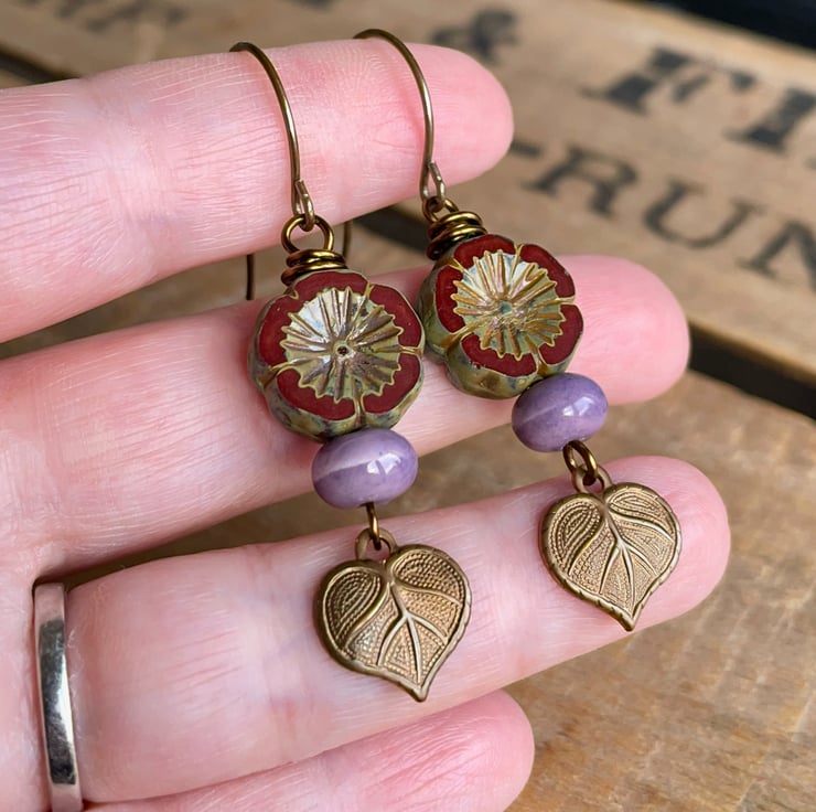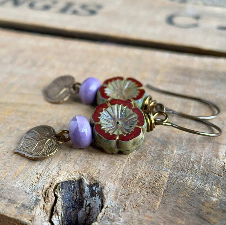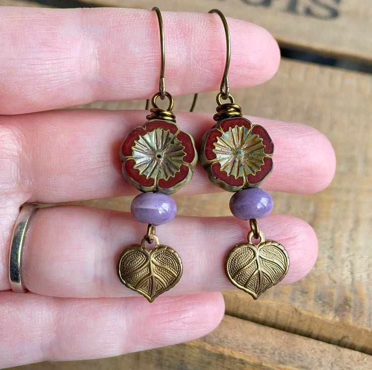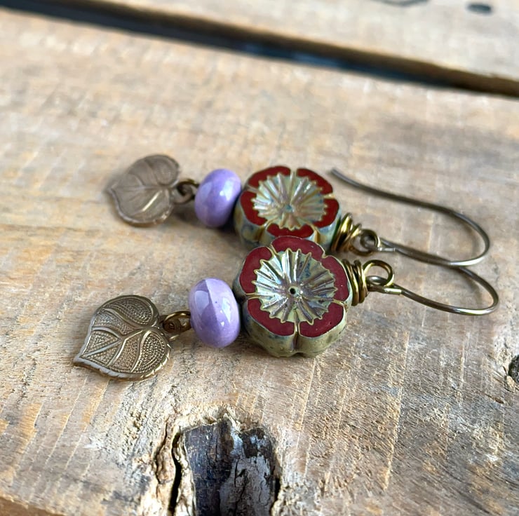 This Autumnal pair of earrings feature burgundy-red Czech glass table-cut flower beads with a rustic Picasso finish around the edges and in their carved centres.