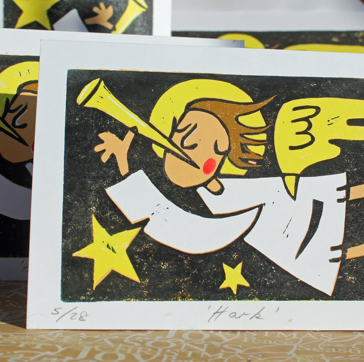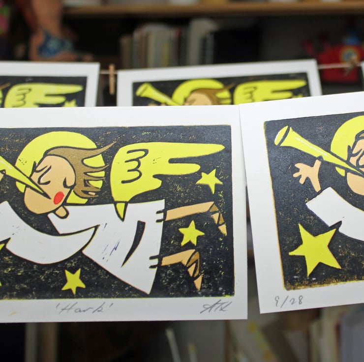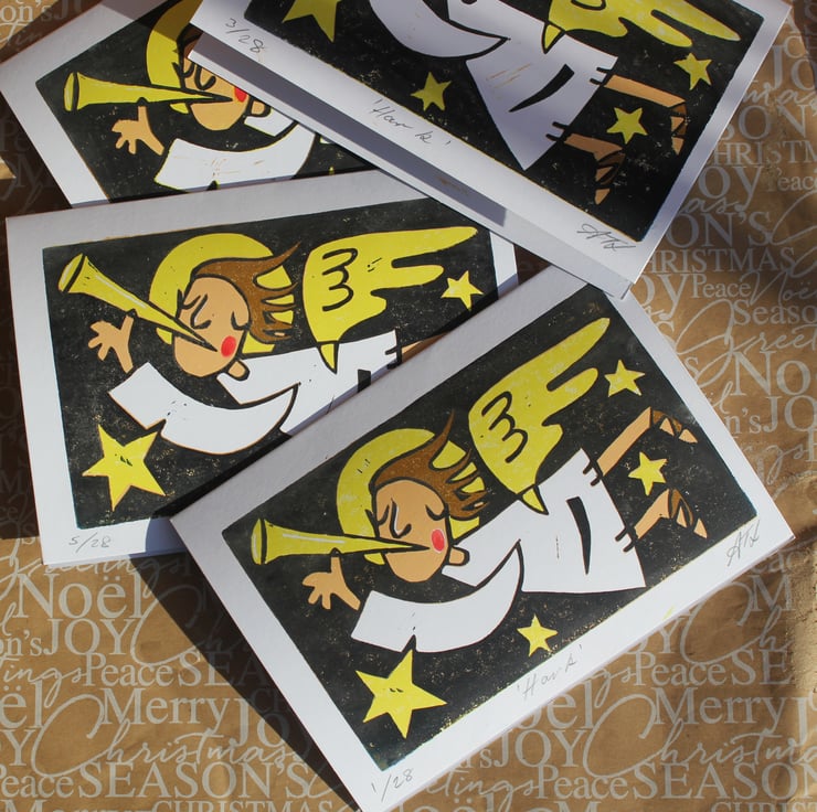 Each card is hand printed 4 times. The lino is gradually cut away for each colour, I then add a touch of watercolour paint for the Angels cheek once the ink has dried.