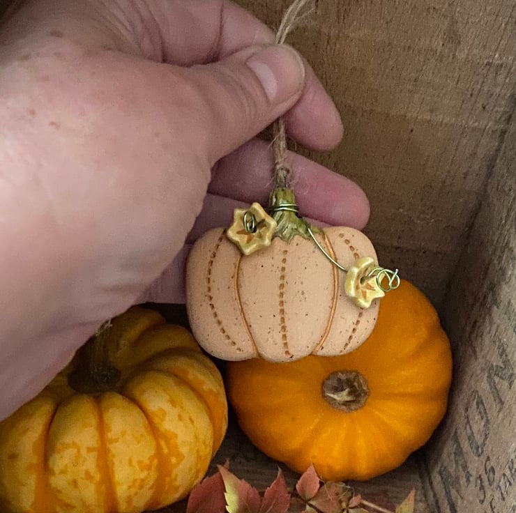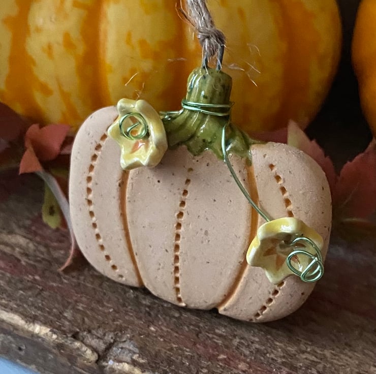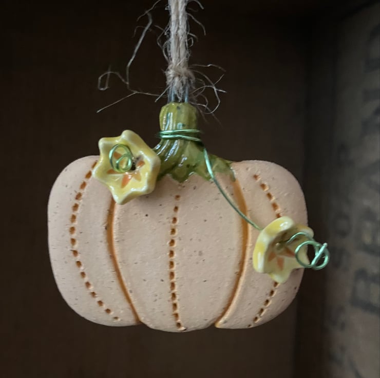 This ceramic pumpkin decoration has been made from speckled stoneware clay and finished with swirly wire additions and flowers. It has been fired twice and finished with bright glossy ceramic glazes. It measures 5cm x 4.5cm x 0.5cm deep and hangs from a brown string.