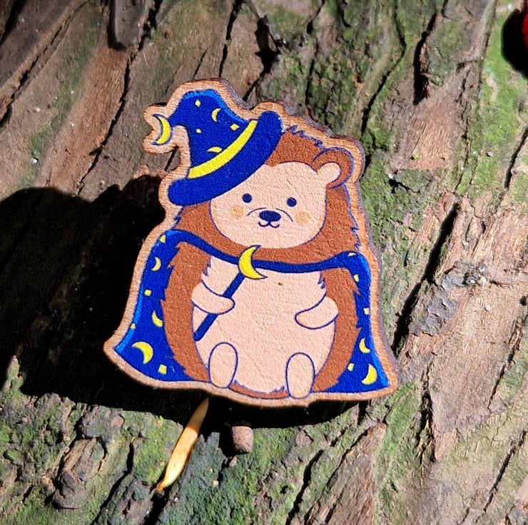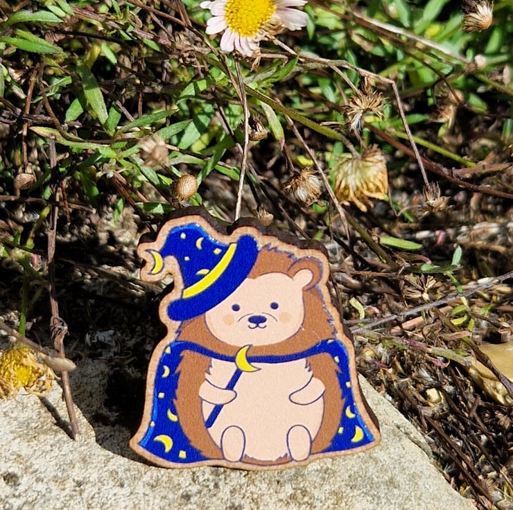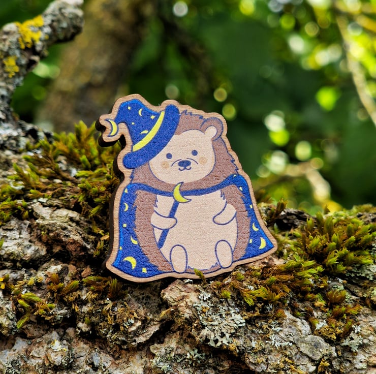 A magical hedgehog pin made from FSC wood in the UK. A perfect gift for hedgehog lovers and magic lovers alike! Comes with a choice of metal or rubber backing, and posted with zero plastic.